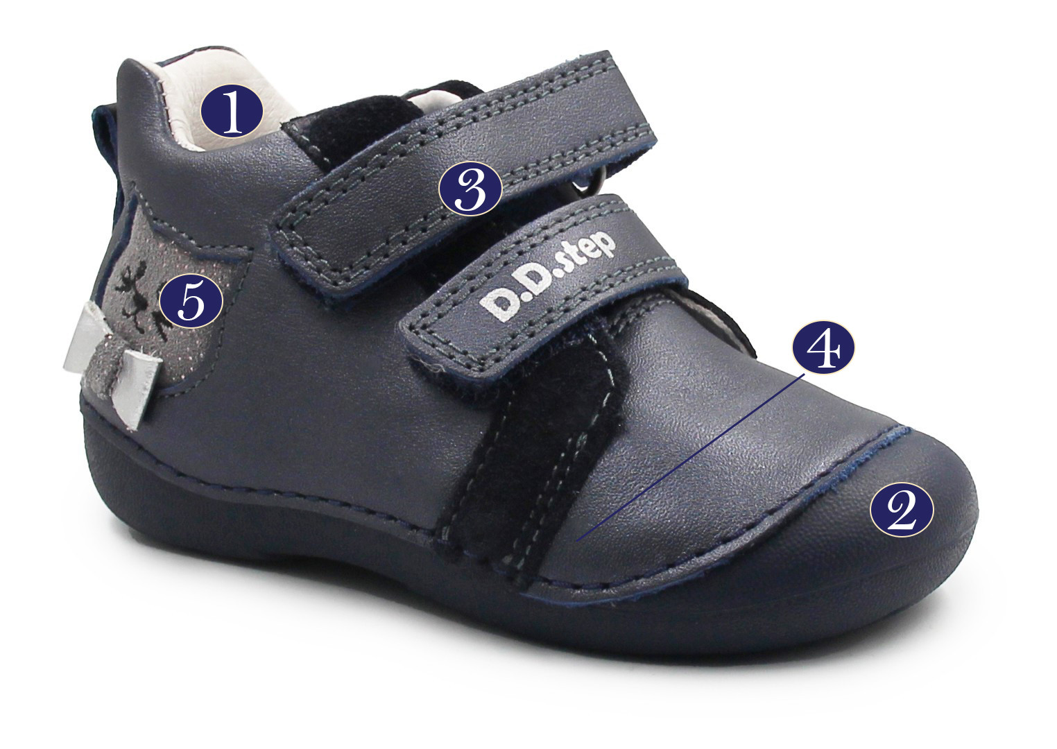 Zarówno z zewnątrz, jak i w środku, wykonane są z miękkiej skóry, co zapewnia komfort i odpowiednią wentylację dla stóp. Ich elastyczna, miękka podeszwa zapewnia swobodę ruchów. Miękki zapiętek delikatnie stabilizuje stopę, jednocześnie pozostawiając dużo miejsca na palce. Zapinane za pomocą dwóch rzepów, co jest praktyczne oraz szybkie, a dodatkowo umożliwia dziecku samodzielne zakładanie. Buty posiadają szersze czubki, co daje więcej miejsca z przodu na paluszki, przez co mogą one zachować naturalne ułożenie.