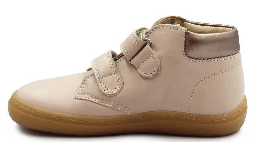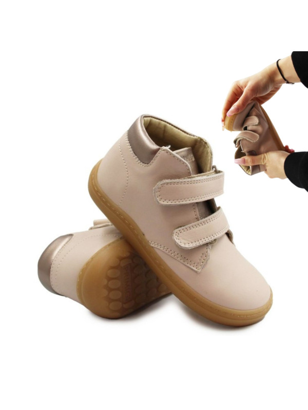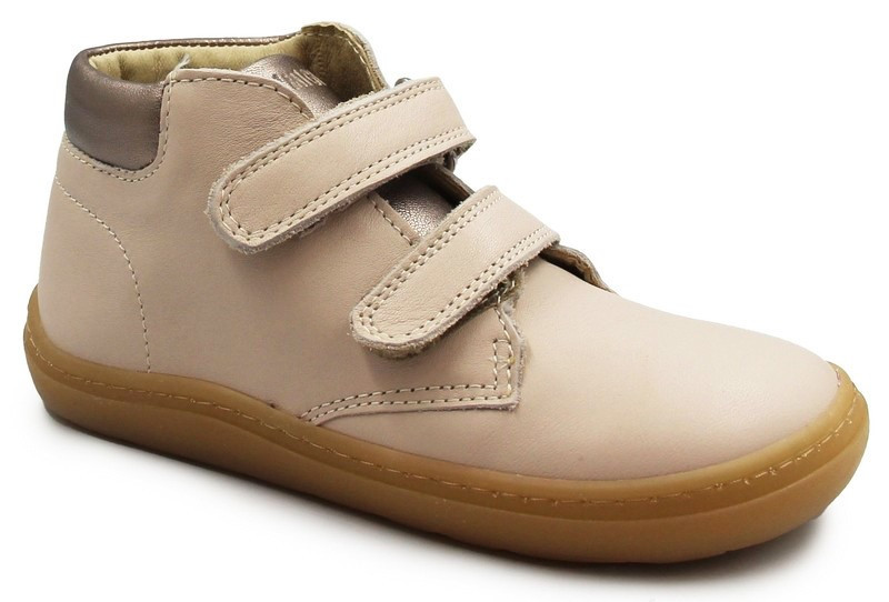 Dziecięce buty na wiosnę z elastyczną podeszwą, która zapewnia swobodę ruchu stopy. Jest szersza w okolicy palców, dzięki czemu palce mogą swobodnie się poruszać. Zapinane za pomocą dwóch praktycznych rzepów.