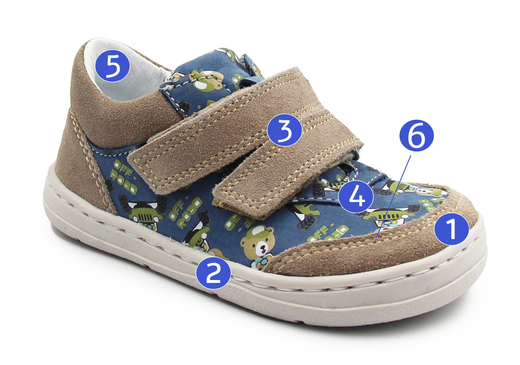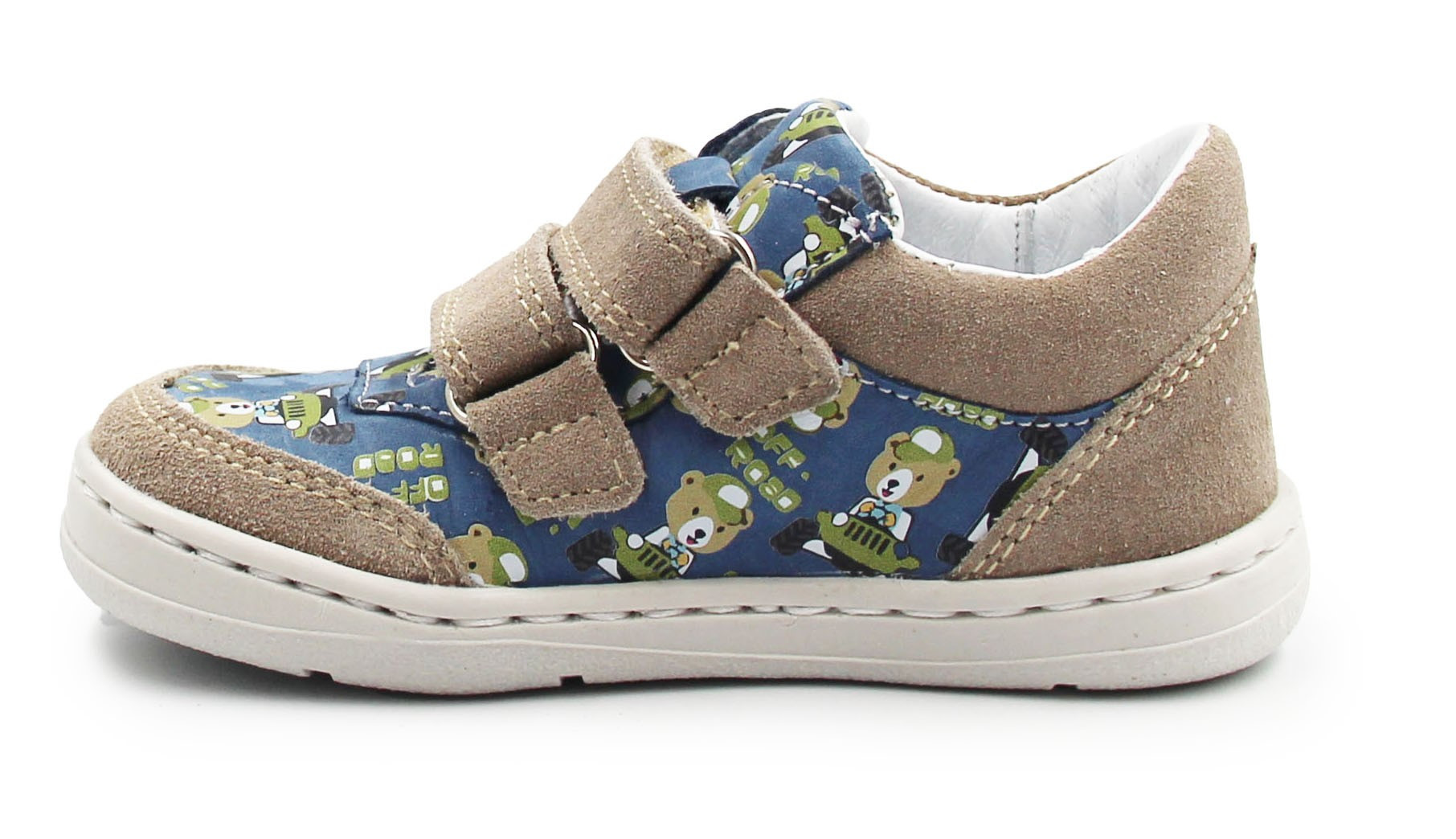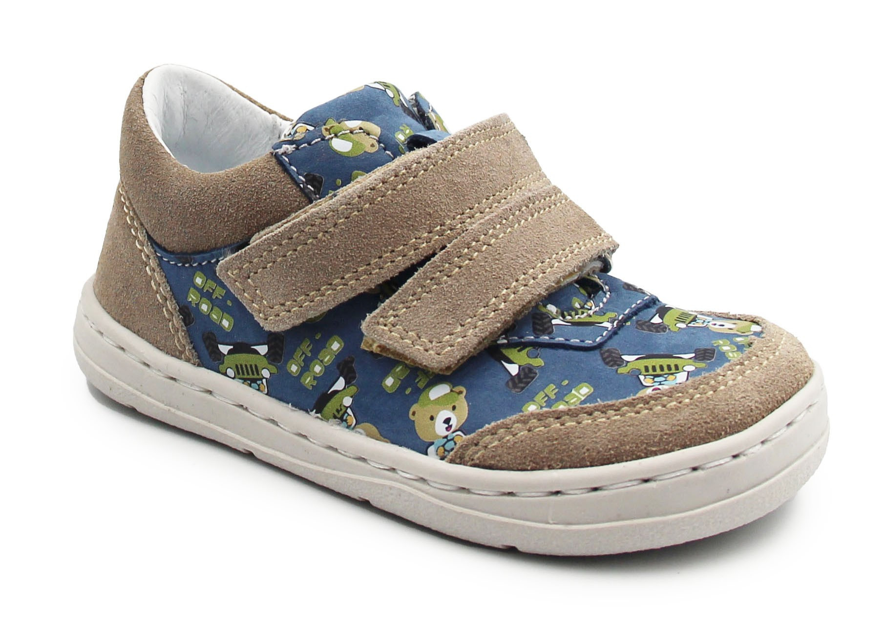 Buty wiosenne dla dziecka, zapinane za pomocą dwóch praktycznych rzepów. Wykonane ze skóry oraz miękkiego weluru. Wkładka jest wyjmowana i dwuczęściowa, dzięki czemu amortyzuje wstrząsy od podłoża oraz poprawia komfort podczas chodzenia. Czubki półbutów są szersze, tak by palce mogły swobodnie się poruszać.