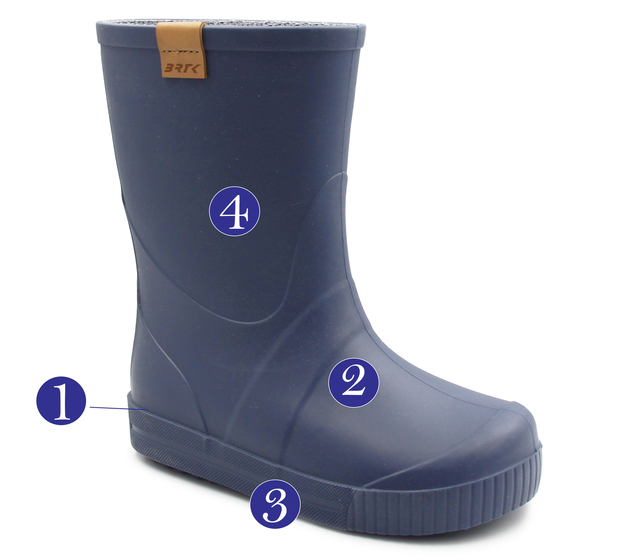 Jest solidna i gruba, co zapewnia dobrą izolację od podłoża. Na całej powierzchni bieżnika znajdują się faliste, poprzeczne żłobienia. Ten wzór ma na celu zapewnienie lepszej przyczepności i zapobieganie poślizgnięciu się na mokrych, błotnistych lub nierównych powierzchniach. Punkty na podeszwie służą również jako amortyzatory, które mają na celu amortyzację wstrząsów od podłoża, na jakie narażona jest stopa podczas chodzenia.