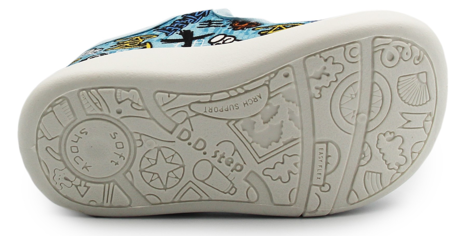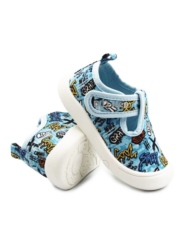 Miękkie kapcie chłopięce wykonane w kolorystyce niebieskich odcieni. Wyprodukowane są z miękkich materiałów przy użyciu technologii Soft Shock oraz Fit Zone. Zapiętek jest miękki oraz lekko wzmocniony. Podeszwa ma za zadanie amortyzować wstrząsy. Zapięcie na rzep umożliwia dopasowanie do szerokości stopy dziecka. Szersze czubki pozwalają palcom na swobodne poruszanie w obuwiu.