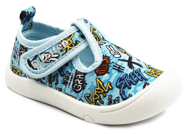 Miękkie kapcie chłopięce wykonane w kolorystyce niebieskich odcieni. Wyprodukowane są z miękkich materiałów przy użyciu technologii Soft Shock oraz Fit Zone. Zapiętek jest miękki oraz lekko wzmocniony. Podeszwa ma za zadanie amortyzować wstrząsy. Zapięcie na rzep umożliwia dopasowanie do szerokości stopy dziecka. Szersze czubki pozwalają palcom na swobodne poruszanie w obuwiu.