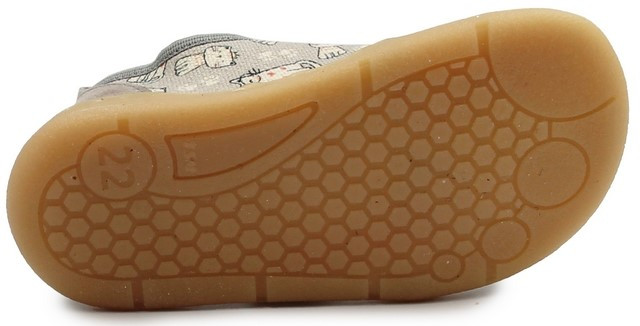 Elastyczne kapcie dziecięce wykonane z naturalnej bawełny, pianki ze skórzanym wnętrzem. Posiadają lekko usztywniony zapiętek, który ma za zadanie stabilizować piętę podczas chodzenia. Podeszwa jest bardzo elastyczna i nie ogranicza ruchomości stopy podczas zabaw.