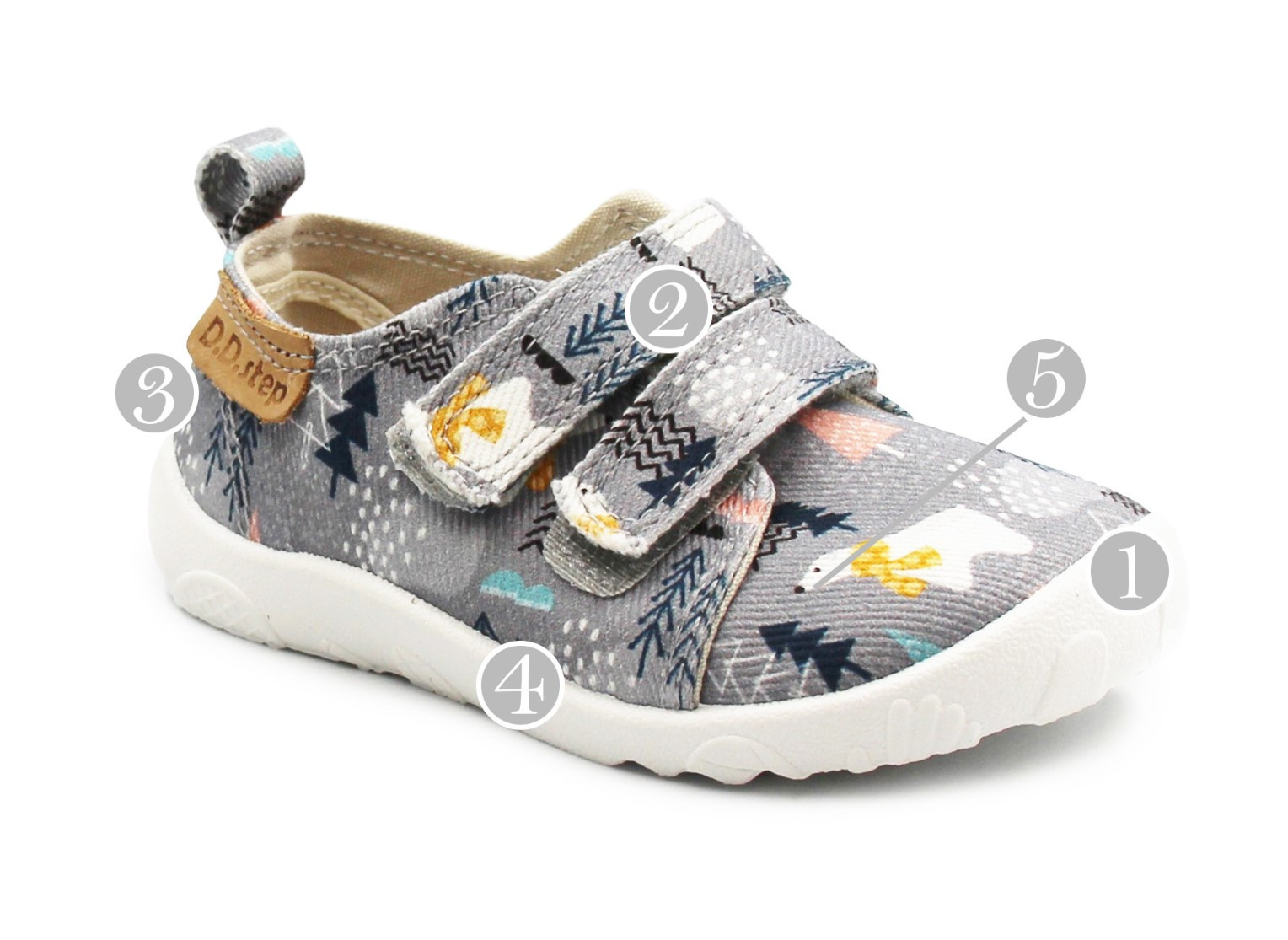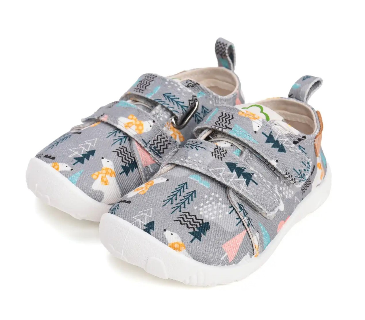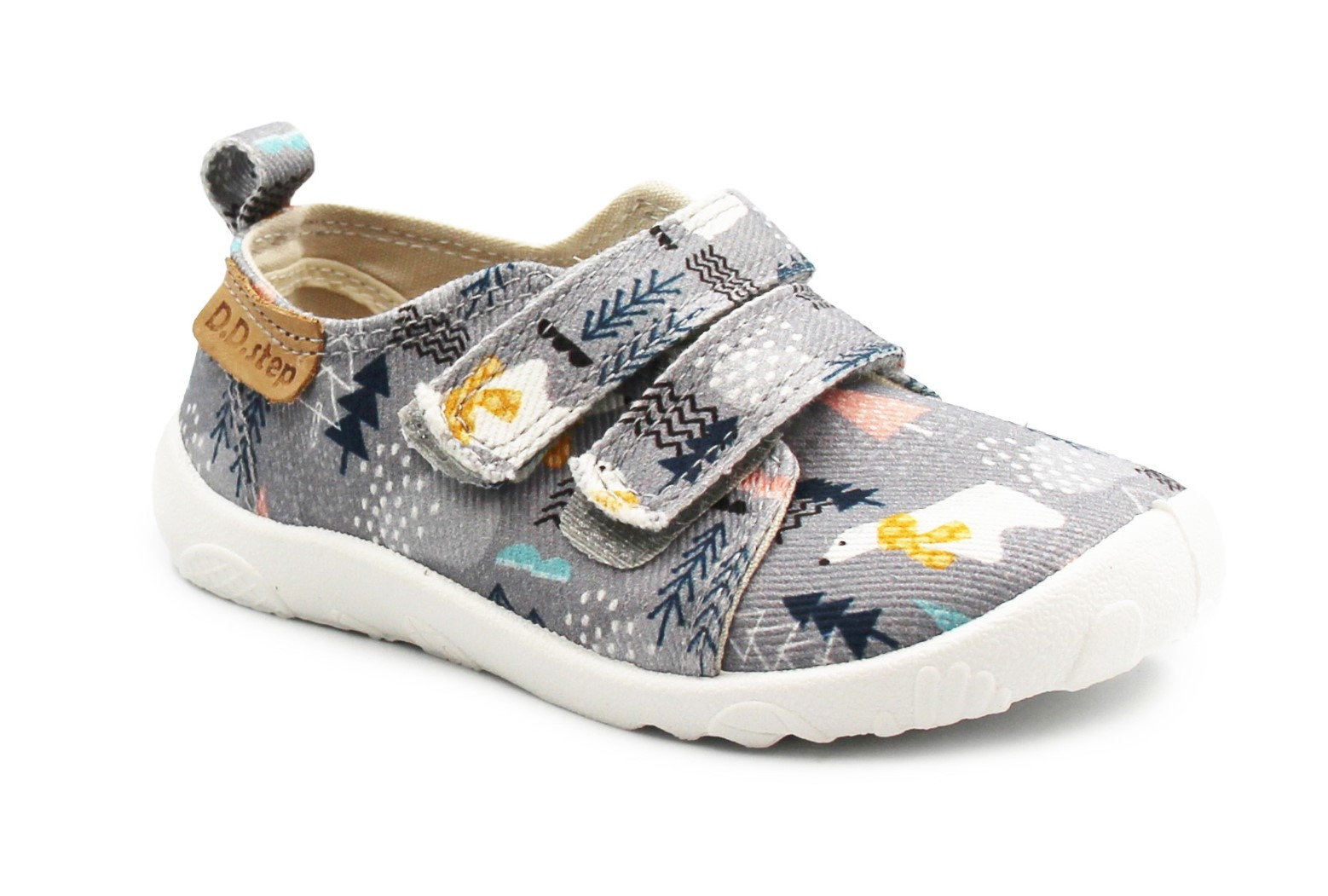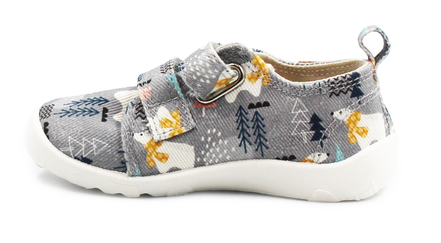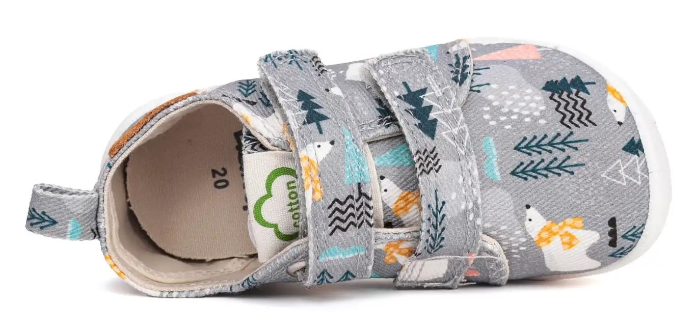 Dziecięce buty tekstylne w kolorystyce szarej. To obuwie zarówno na dwór jak i jako obuwie zmienne do szkoły czy przedszkola. Regulowane za pomocą dwóch rzepów, które są szybkie, łatwe oraz praktyczne w użyciu. Wkładka delikatnie podpiera łuk stopy.