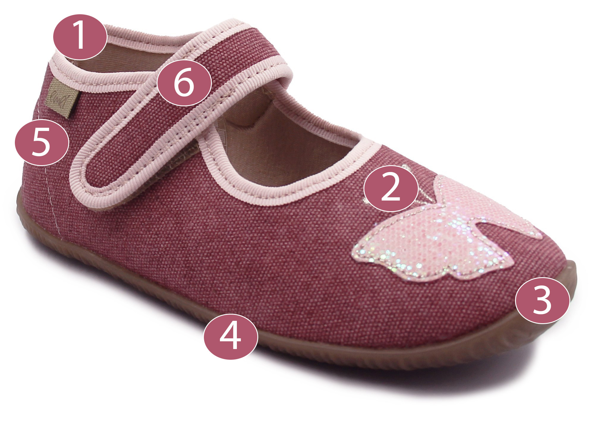 6. Zapięcie na rzep, umożliwia dopasowanie kapci do  stopy dziecka.