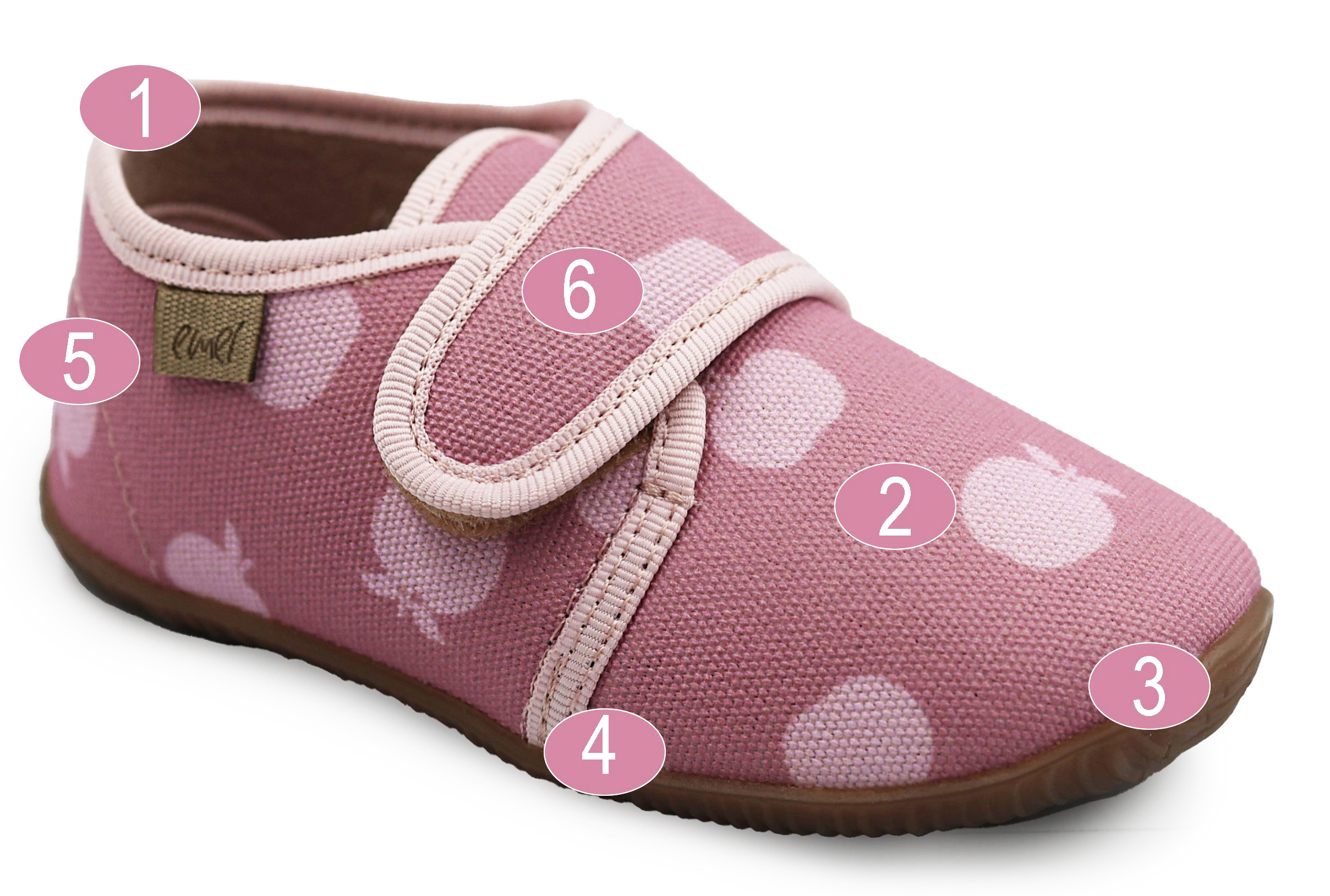 6. Zapięcie na rzep, umożliwia dopasowanie kapci do stopy dziecka.