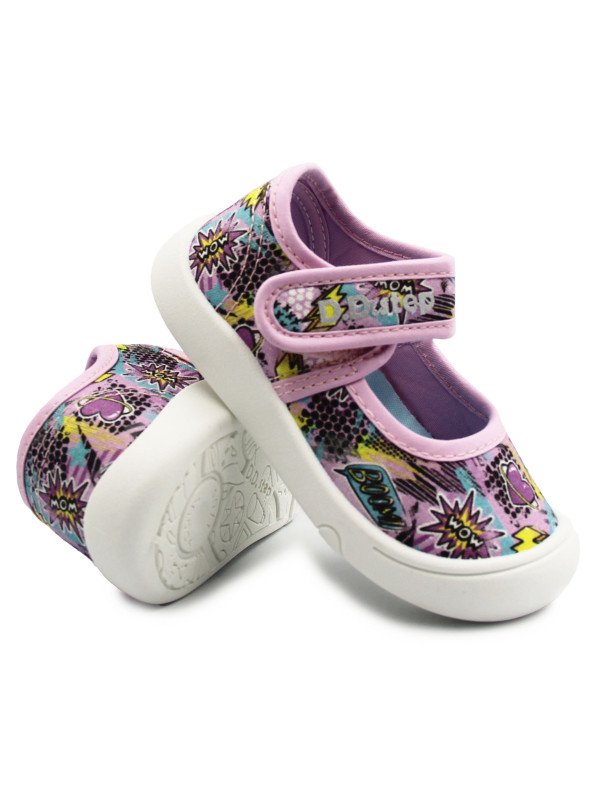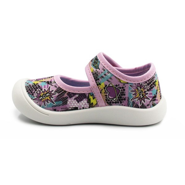 Miękkie kapcie dziewczęce wykonane w kolorystyce różowej. Wyprodukowane są z miękkich materiałów przy użyciu technologii Soft Shock oraz Fit Zone. Zapiętek jest miękki oraz lekko wzmocniony. Podeszwa ma za zadanie amortyzować wstrząsy. Zapięcie na rzep umożliwia dopasowanie do szerokości stopy dziecka. Szersze czubki pozwalają palcom na swobodne poruszanie w obuwiu.