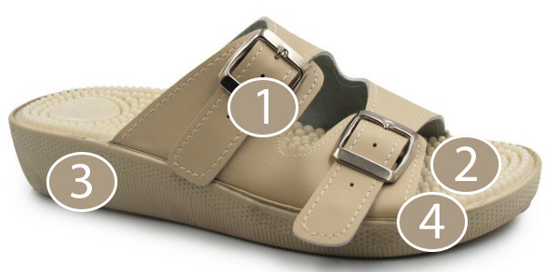Klapki wyposażone są w kolce, które stymulują punkty akupresury w stopach.