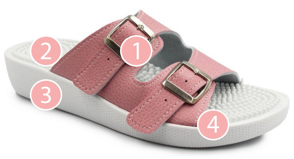 Klapki wyposażone są w kolce, które stymulują punkty akupresury w stopach.