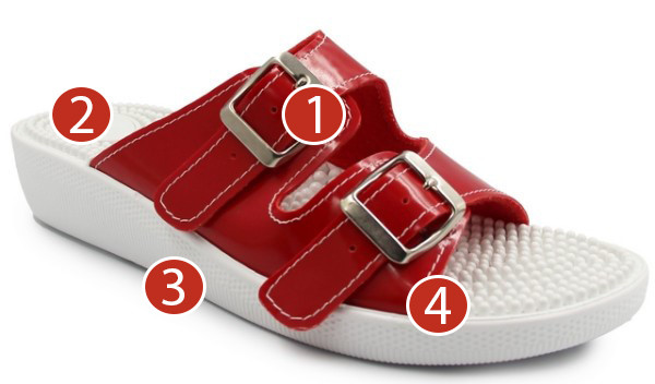 Klapki wyposażone są w kolce, które stymulują punkty akupresury w stopach.