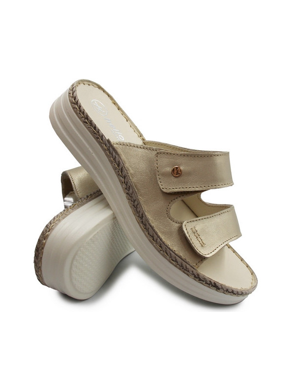 Skórzane złote klapki do pracy na koturnie dla kobiet Helios 122 złoty