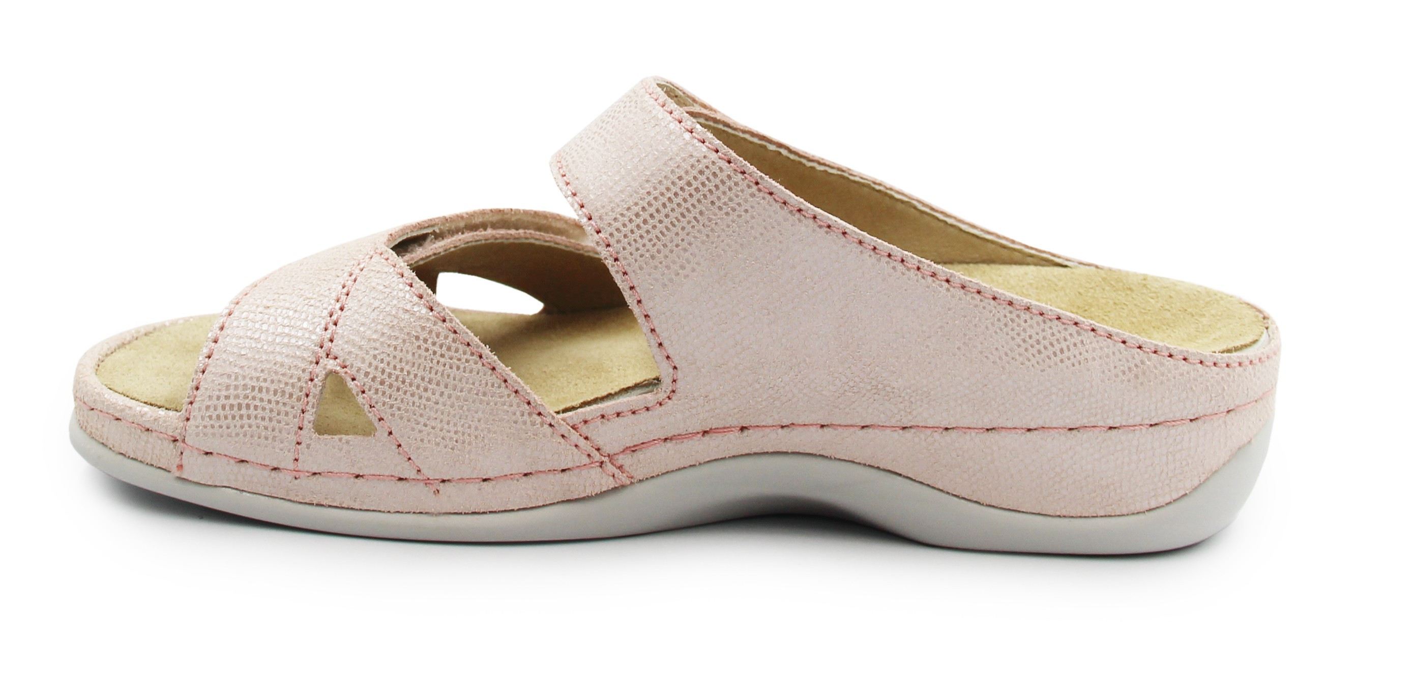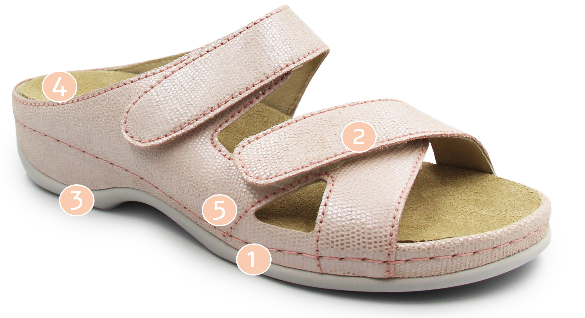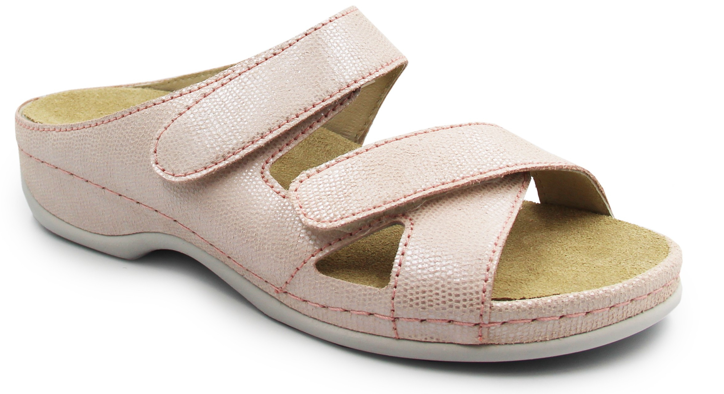 Wygodne klapki damskie z praktycznym zapięciem na rzep, które dają możliwość dopasowania obuwia do indywidualnej szerokości stopy. Wkładka jest miękka, wykonana ze skóry, posiada możliwość wyjęcia i wyposażona jest w właściwości, które mają wpływ na poprawę komfortu podczas wielogodzinnego chodzenia. Podeszwa posiada funkcję amortyzującą wstrząsy od podłoża na jakie stopa jest narażona podczas chodu, co korzystnie wpływa na zmniejszenie uczucia zmęczonych nóg.