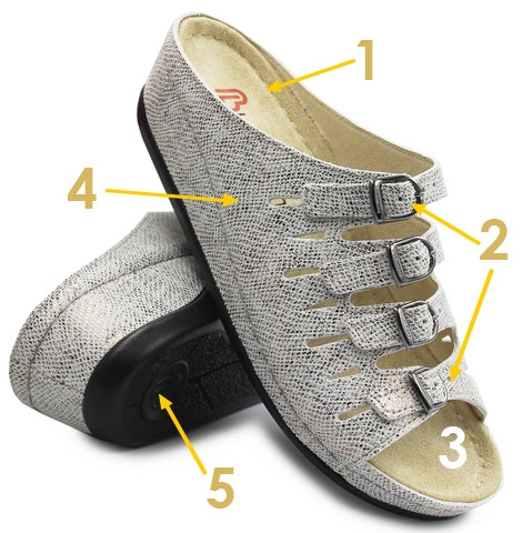 1. Wkładka wykonana ze skóry naturalnej, dzięki czemu skóra się nie poci a buty nadają się do całodziennego stania lub chodzenia np. w pracy czy na wakacjach