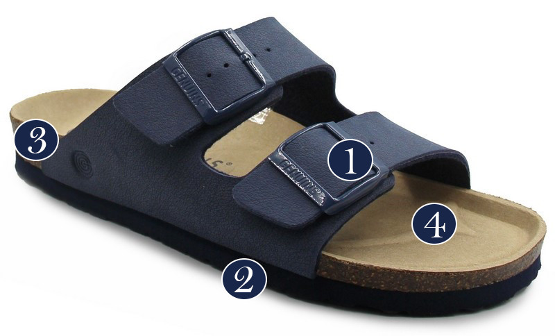 Wierzch buta został wykonany z wegańskiego materiału syntetycznego a wnętrze z materiału włókienniczego. Wkładka została wyprodukowana z naturalnego korka i pianki oraz pokryta jest miękką syntetyczną mikrofibrą. Dzięki regulowanemu zapięciu, buty można dopasować do indywidualnych preferencji.
