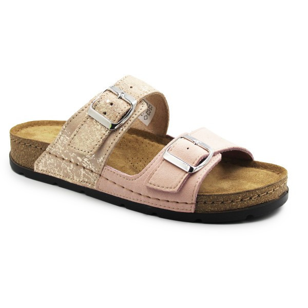 Damskie klapki na lato z miękką wkładką, która daje komfort nawet podczas długiego noszenia obuwia. Błyszczący pozłacany pasek dodaje klapkom elegancki wygląd. Wyposażone w regulowane sprzączki na obydwóch paskach, co pozwala na dokładniejsze dopasowanie do szerokości stopy. Lekka elastyczna podeszwa przypominająca korek oferuje wysoki komfort oraz styl. Klapki sprawdzą się jako obuwie domowe, klapki wakacyjne, obuwie do pracy. Pamiętaj by nie były poddawane warunkom ciężkim jak np. pyły, zbyt wysokie temperatury, wilgoć.