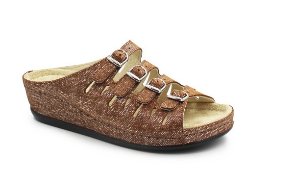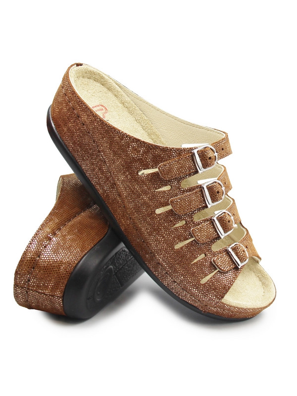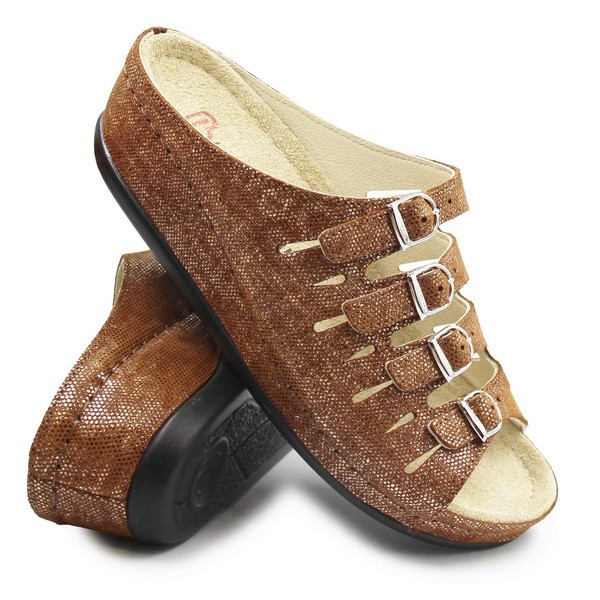 Wygodne klapki damskie z praktycznym zapięciem, które dają możliwość dopasowania obuwia do indywidualnej szerokości stopy. Wkładka jest miękka, wykonana ze skóry, posiada możliwość wyjęcia i wyposażona jest w właściwości, które mają wpływ na poprawę komfortu podczas wielogodzinnego chodzenia. Podeszwa posiada funkcję amortyzującą wstrząsy od podłoża na jakie stopa jest narażona podczas chodu, co korzystnie wpływa na zmniejszenie uczucia zmęczonych nóg.