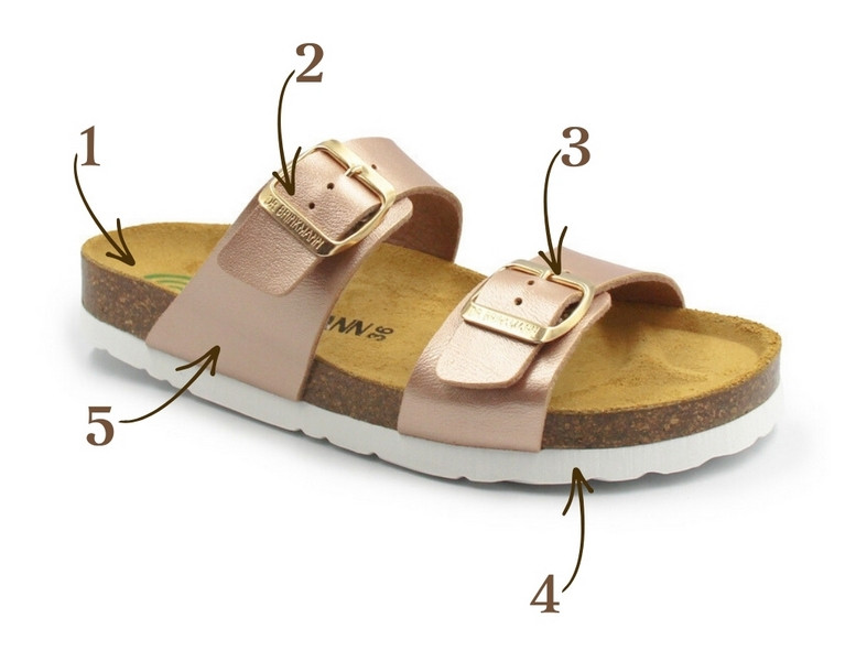 1. Wkładka - wykonana ze skóry naturalnej, osadzona na korkowo - lateksowej bazie. Posiada profilowaną konstrukcję, która dopasowuje się do kształtu stopy w trakcie użytkowania.