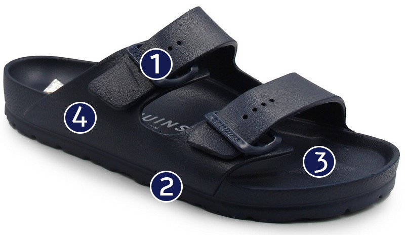 Klapki sprawdzą się na plażę, basen, do pracy oraz na co dzień. Posiadają właściwości wodoodporne. Wykonane są z materiału EVA, zapinane za pomocą dwóch klamr, które umożliwiają dokładniejsze dopasowanie do stopy. Wkładka dopasowuje się od anatomicznych kształtów stopy użytkownika.