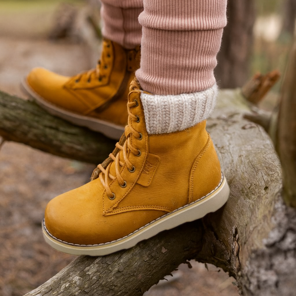 Wnętrze trzewików wyściełane jest naturalną wełną, która stanowi doskonałą izolację termiczną. Ten materiał nie tylko grzeje, ale też odprowadza nadmiar wilgoci, zapobiegając poceniu się stóp. Dzięki temu buty zapewniają idealny mikroklimat, nawet podczas długich spacerów w chłodne dni.