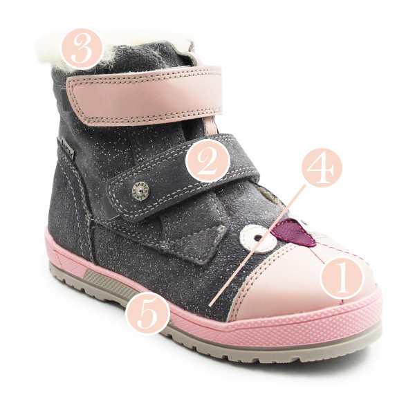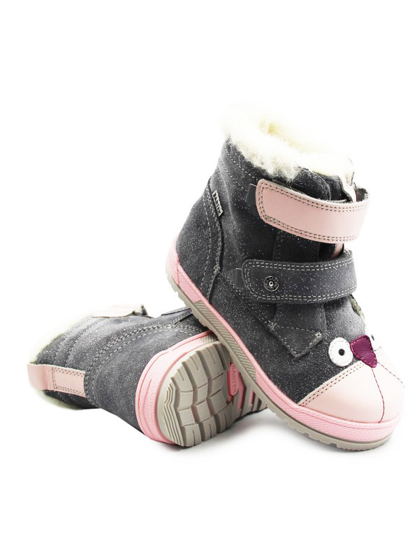 Dziewczęce buty ocieplane z ozdobnym elementem na czubku. Wyposażone we dwa zapięcia za pomocą rzepu. Wnętrze otulone jest miękką wełną owczą, która gwarantuje ciepło. Podeszwa została wykonana z materiału TPR, który zapewnia dobrą przyczepność do podłoża.