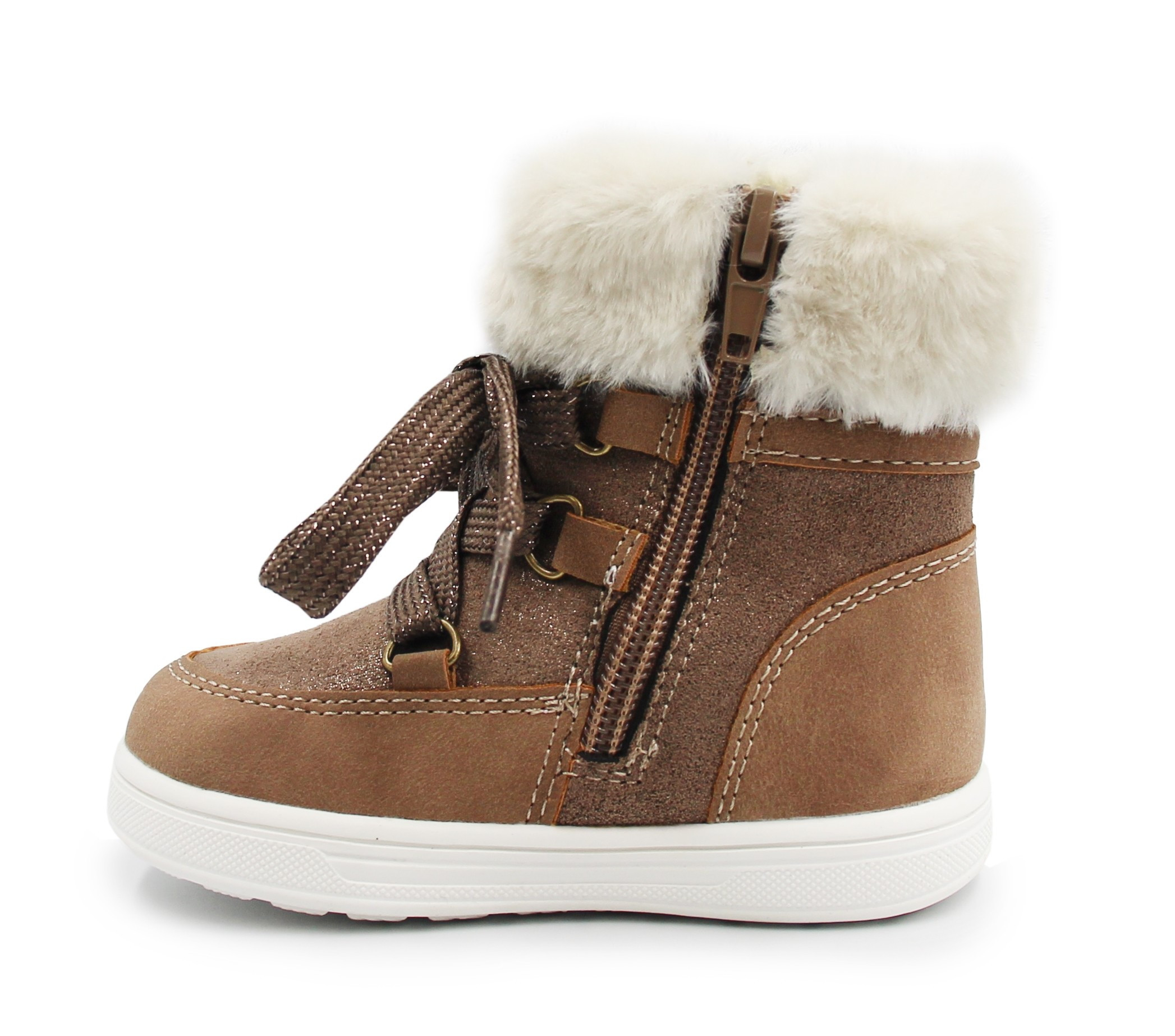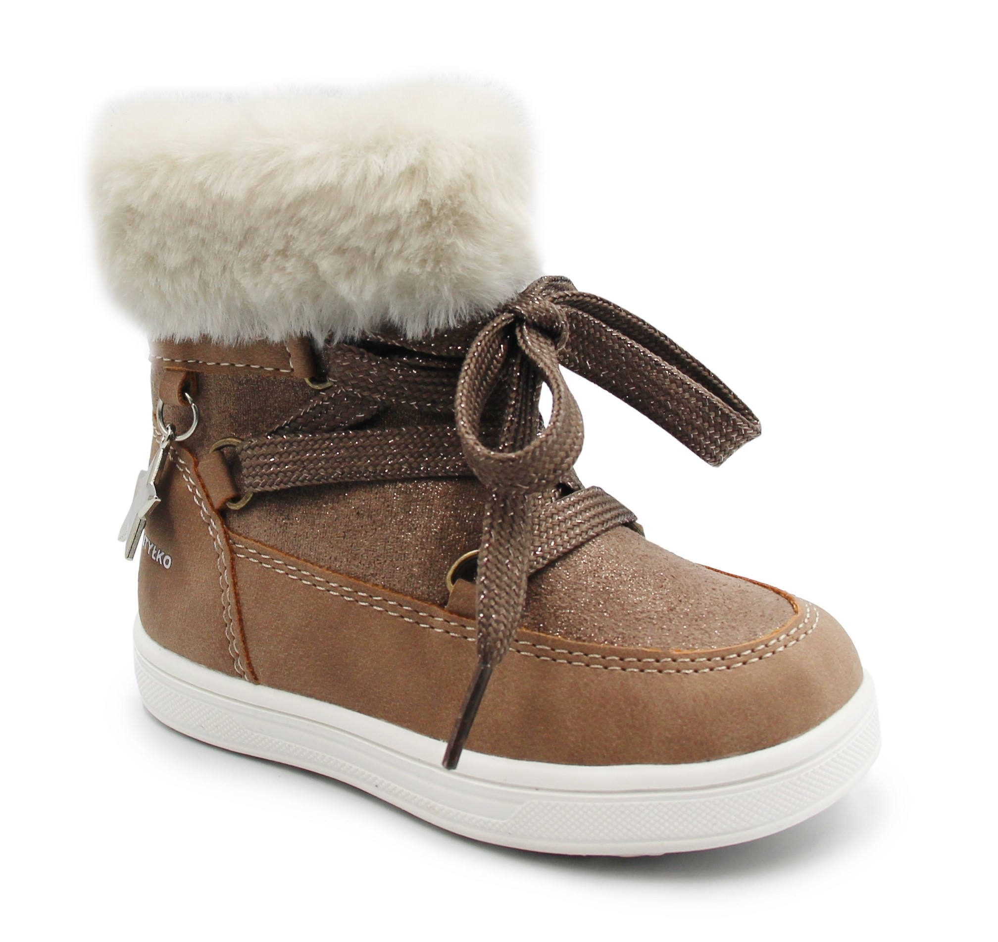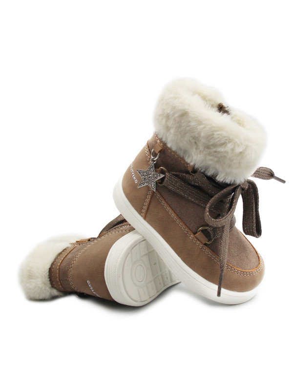 Dziewczęce buty zimowe, ich wnętrze pokryte jest miękkim futerkiem, które zapobiega odczuwaniu zimnych temperatur. Zapinane za pomocą sznurowadeł oraz suwaka. Z boku obuwia znajduje się ozdobna przypinka w postaci gwiazdki. Antypoślizgowa tekstura na spodzie buta to dodatkowa przyczepnosć do podłoża.