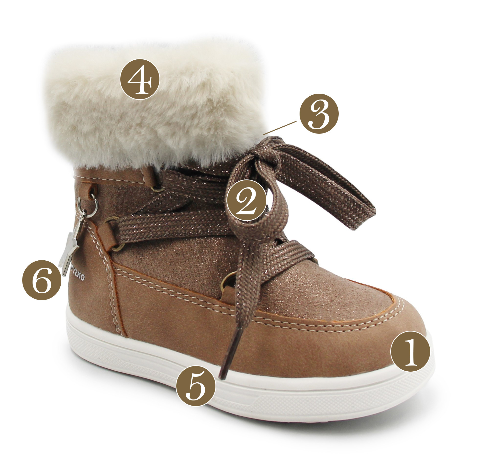Dziewczęce buty zimowe, ich wnętrze pokryte jest miękkim futerkiem, które zapobiega odczuwaniu zimnych temperatur. Zapinane za pomocą sznurowadeł oraz suwaka. Z boku obuwia znajduje się ozdobna przypinka w postaci gwiazdki. Antypoślizgowa tekstura na spodzie buta to dodatkowa przyczepnosć do podłoża.