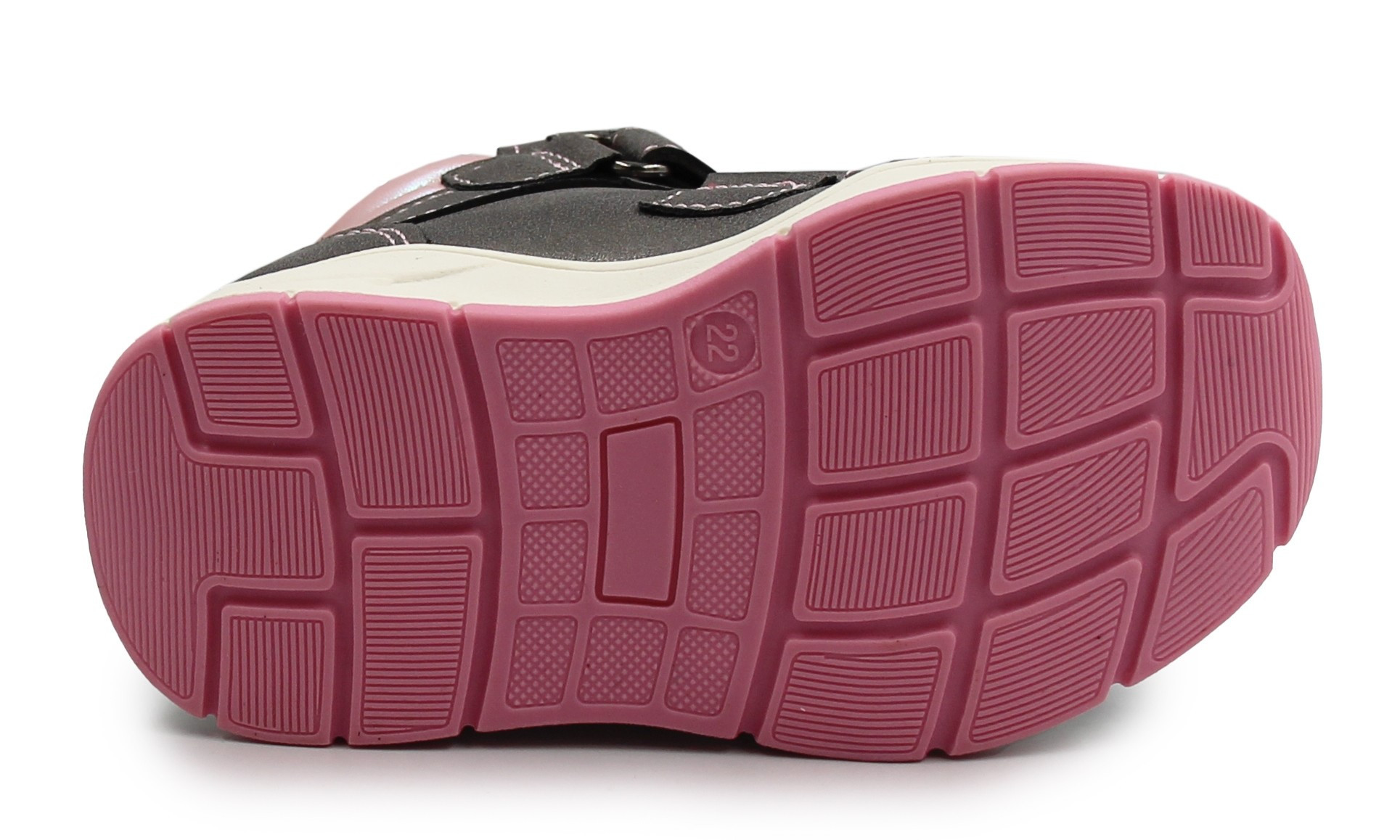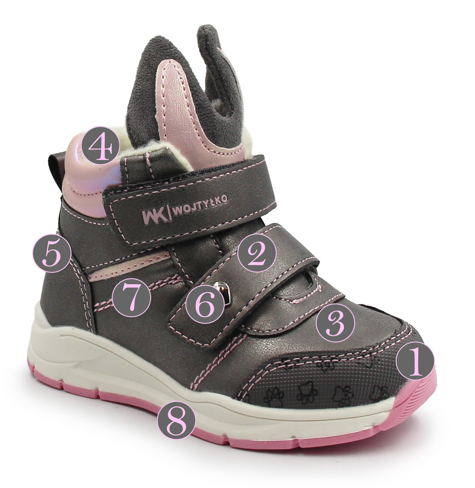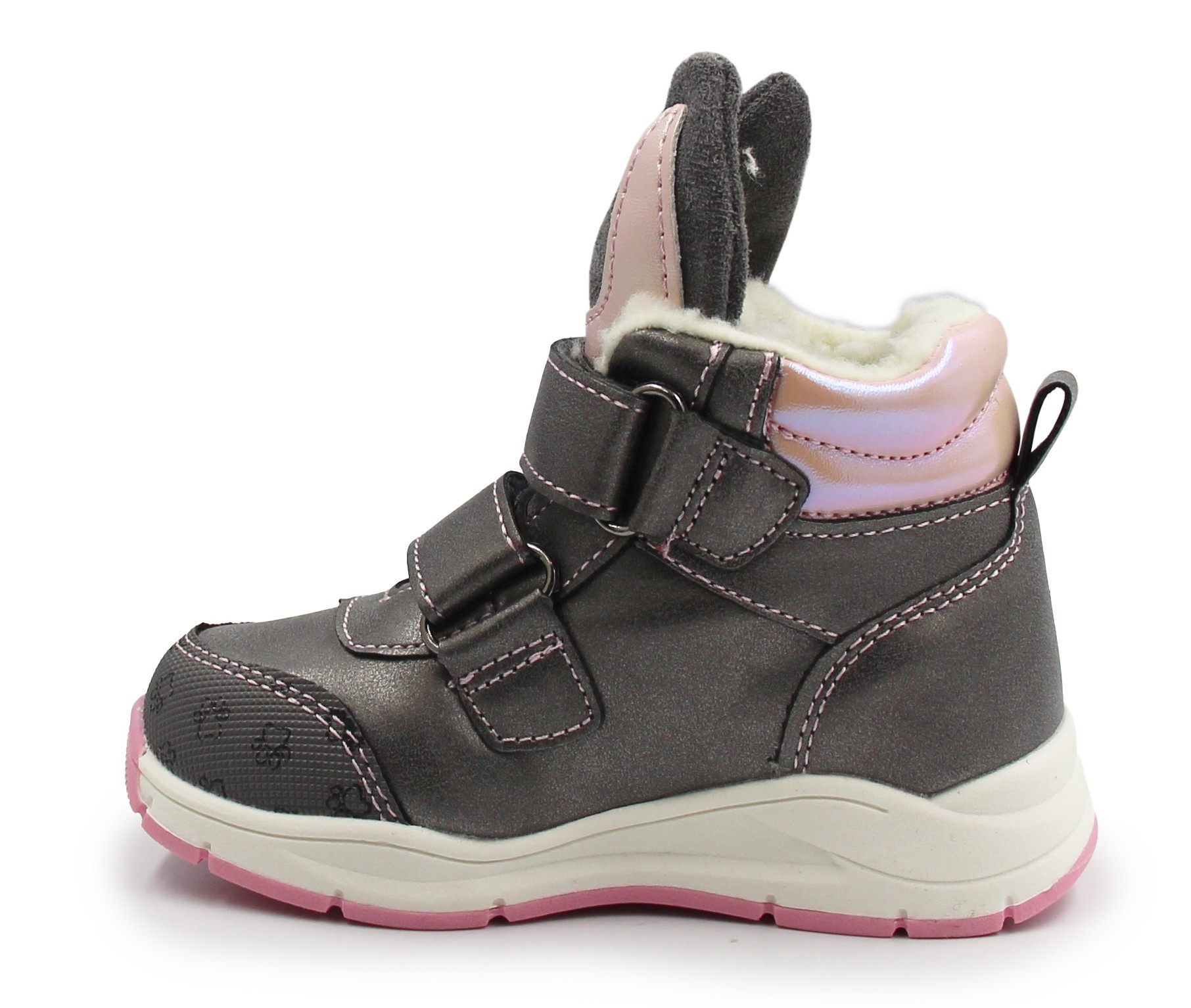 Dziewczęce buty na zimę wypełnione wewnątrz miękkim materiałem ocieplanym, który ogrzewa stopy podczas chłodniejszych temperatur. Zapinane za pomocą dwóch rzepów, które praktyczne, szybkie oraz łatwe w użyciu. Na butach znajdują się dwa uszka, które dodają im uroku.
