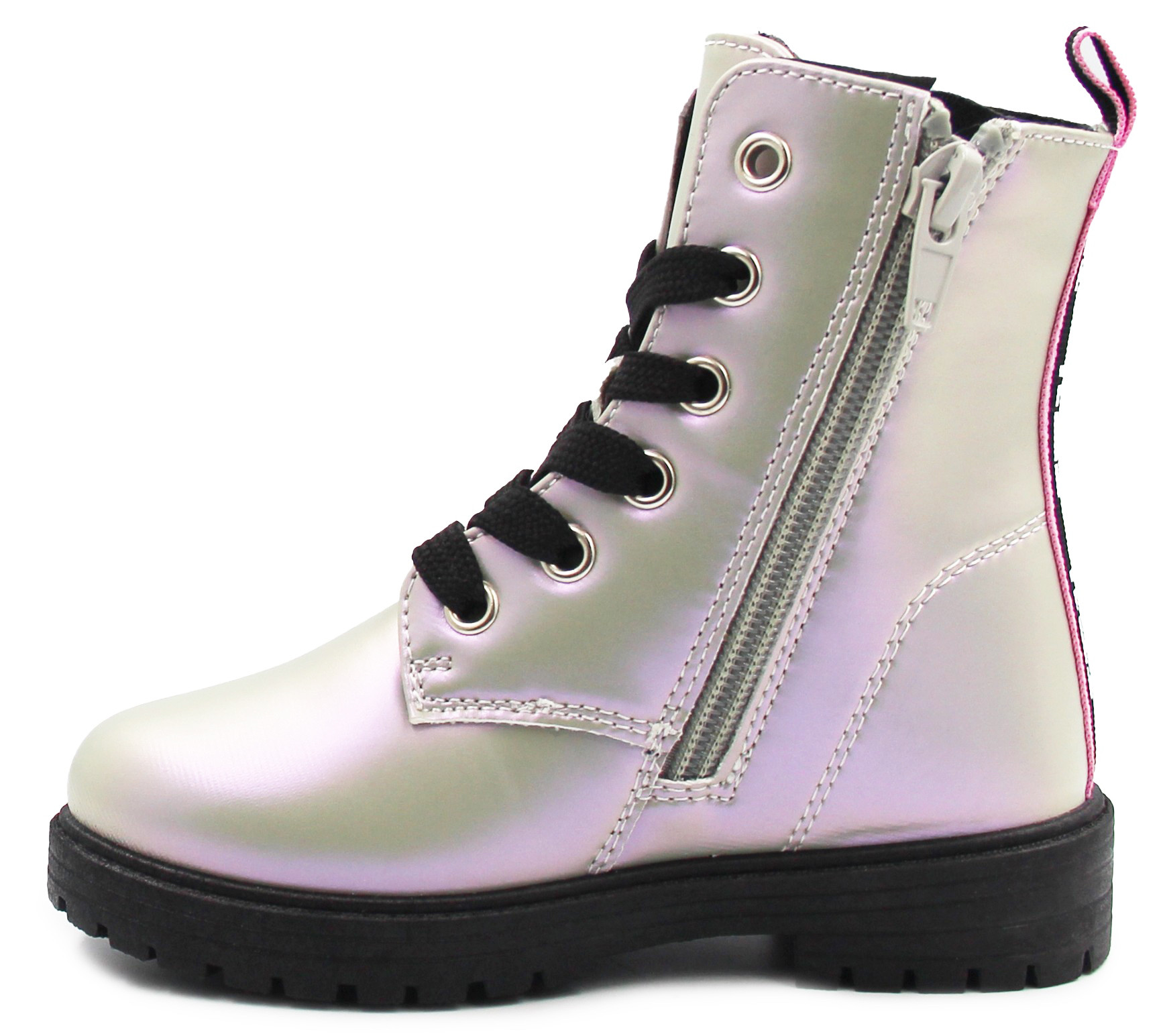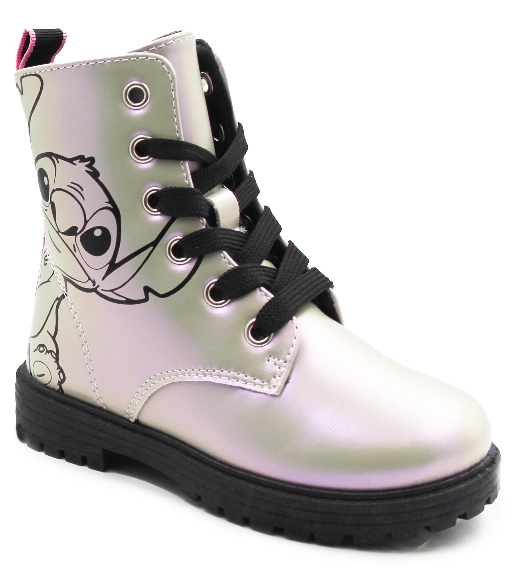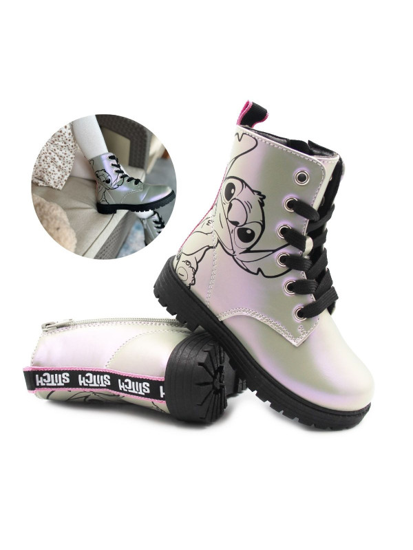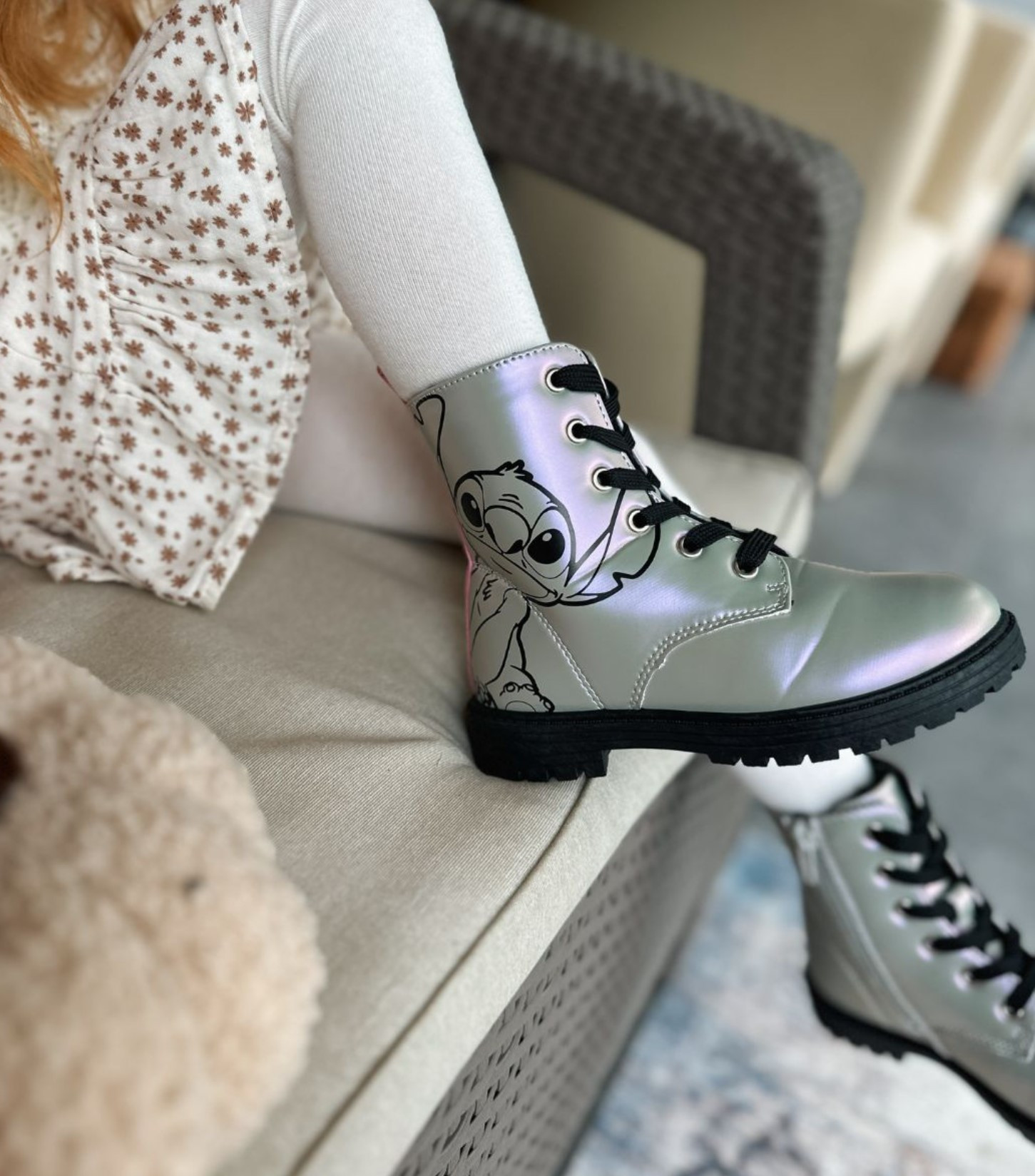 Efekt WOW! Materiał wierzchni z efektem holograficzny. Buty mienią się przy każdym ruchu, dodając magii codziennym stylizacjom. Wnętrze trzewików wyściełane jest miękkim materiałem tekstylnym, który zapewnia miękkość oraz lekkie ocieplenie. Zapinane za pomocą praktycznego suwaka oraz sznurowadeł. W zewnętrznej stronie buta znajduje się bohater znanej bajki Lilo i Stitch.