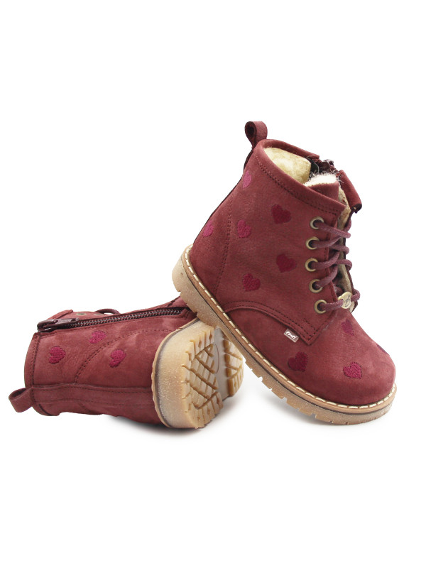 Ręcznie wykonane trzewiki Emel EV 2727F Bergen to połączenie ciepła, wygody i wyjątkowego stylu. Ten model w głębokim odcieniu bordo, ozdobiony delikatnymi serduszkami, powstał z myślą o dziewczynkach, które lubią łączyć komfort z uroczym wyglądem. Buty są w całości wykonane ze skóry naturalnej, dzięki czemu doskonale dopasowują się do stopy i zapewniają trwałość przez wiele sezonów.