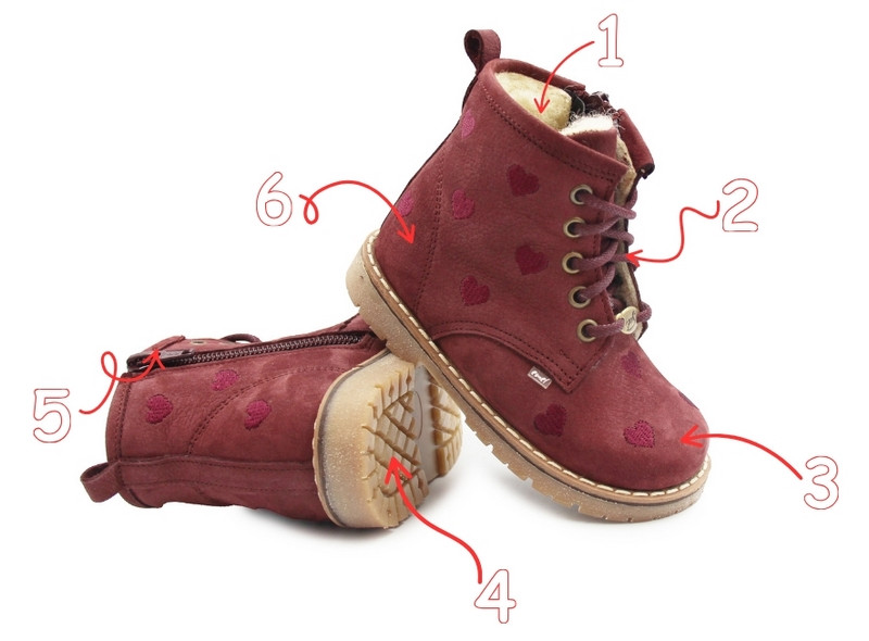 6. Skóra naturalna wysokiej jakości - miękka, trwała i bezpieczna dla skóry dziecka. Bordowy kolor i haftowane serduszka nadają butom wyjątkowy, dziewczęcy charakter.