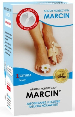 Aparat korekcyjny na haluksy Marcin I, opracowany przez firmę NEURON w 1985 roku, to innowacyjne urządzenie przeznaczone do korekcji palucha koślawego. Używany podczas snu i wypoczynku, aparat zapewnia skuteczną i wygodną terapię haluksów. Urządzenie przeznaczone do nocnego stosowania. Jego głównym zadaniem jest delikatne, stopniowe korygowanie ustawienia dużego palca stopy, który w przypadku haluksów odchyla się w kierunku pozostałych palców. Regularne noszenie aparatu może przyczynić się do zmniejszenia bólu, poprawy wyglądu stopy oraz zahamowania progresji deformacji.