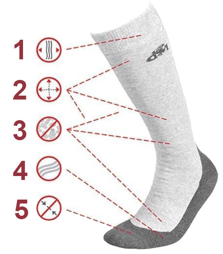 • Specjalna konstrukcja cholewki i niewielka domieszka lycry w całej skarpetce powodują idealne, bezuciskowe przyleganie do nóg i maksymalną elastyczność