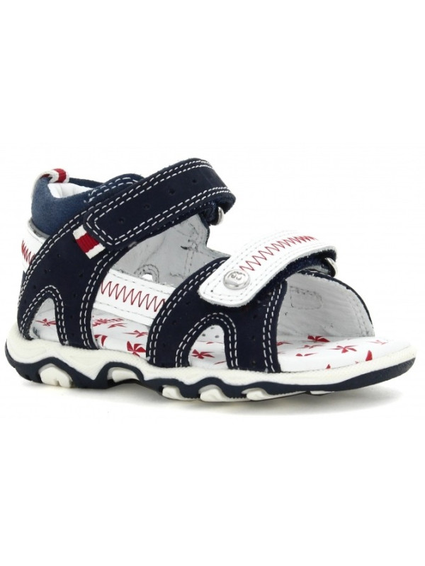 Sandałki chłopięce w marynarskim stylu. Kolorystyka granatowo-biała z czerwonymi elementami.