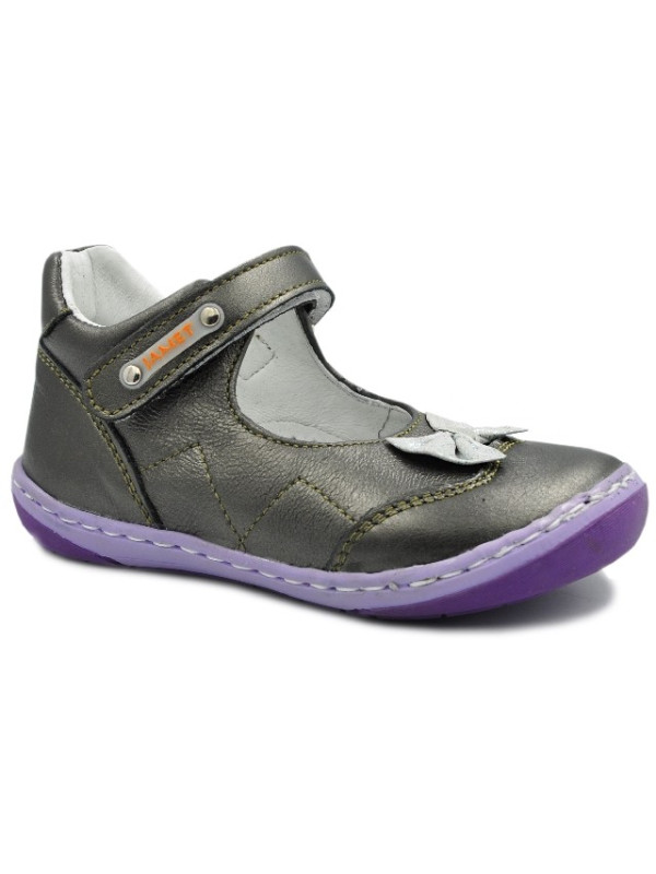 Dziewczęce baleriny firmy Jamet w kolorze ciemnego srebra z fioletową kokardą.