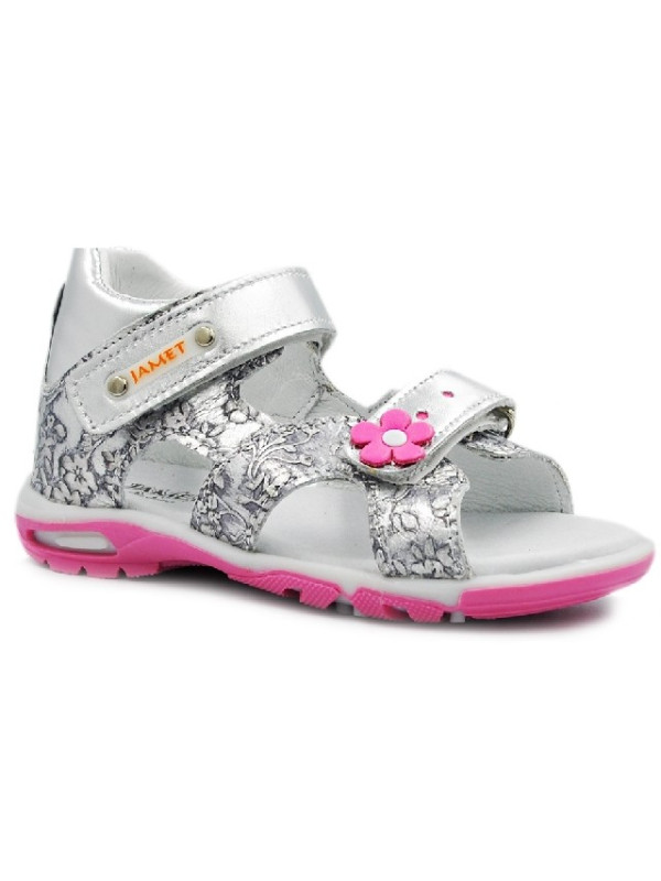 Dziecięce sandałki firmy Jamet w kolorze srebrnym z różowym kwiatuszkiem.