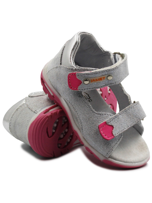 Dziecięce sandałki firmy Jamet w kolorze srebrnym z uroczym różowym kwiatuszkiem.