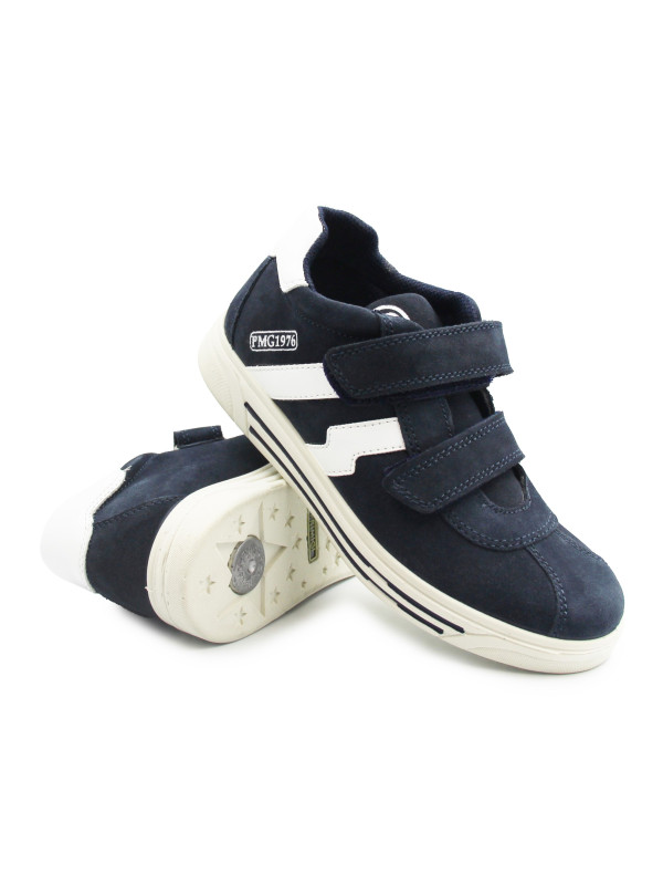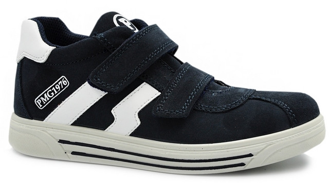 Dziecięce trzewiki firmy Primigi w modnym kolorze granatu, czerni i bieli.
