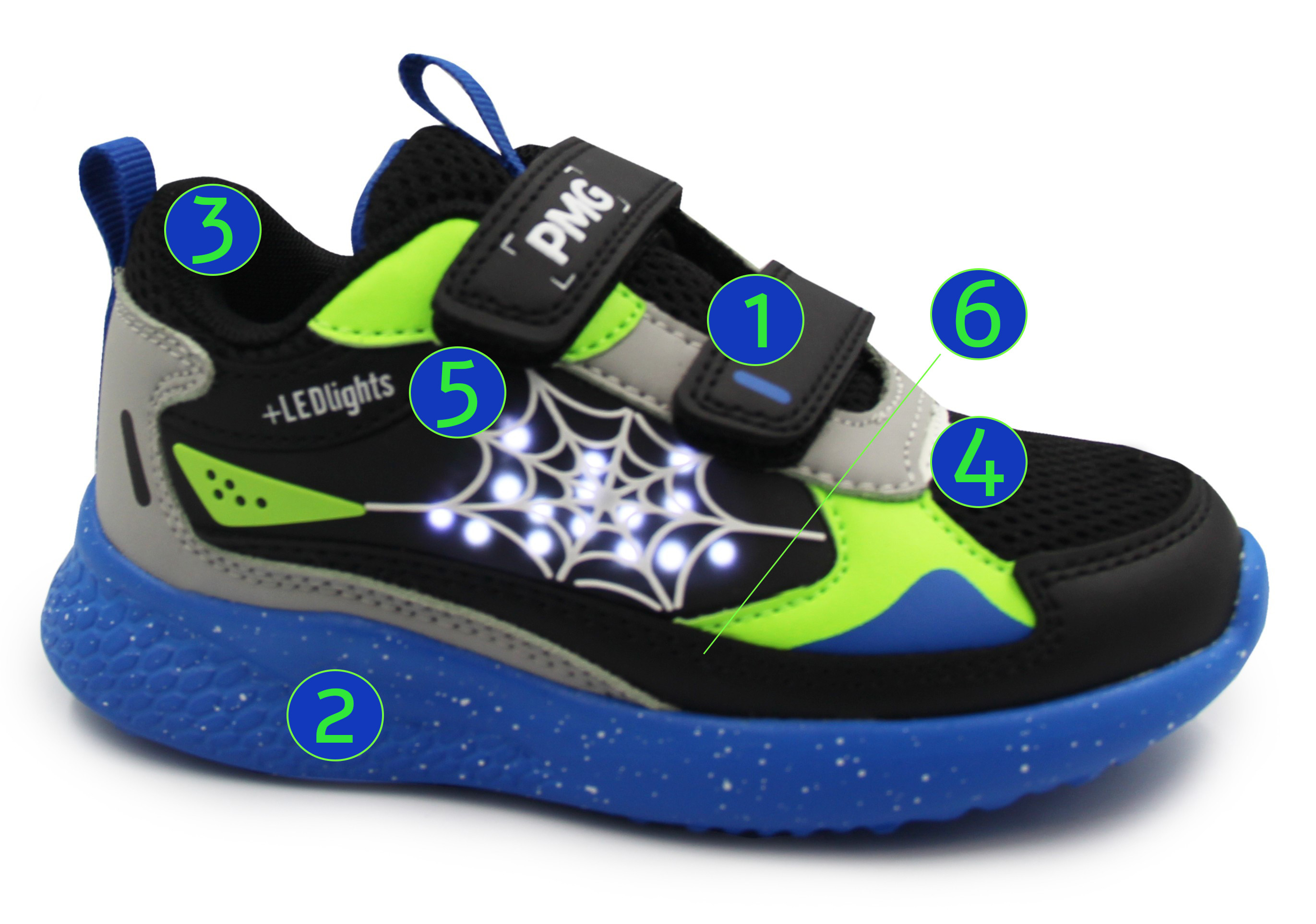 Elementy LED włączają się po uderzeniu podczas chodzenia. By były uruchomione należy wcisnąć przycisk, który znajduje się z boku butów. Działa on również jako opcja "wyłącz".
