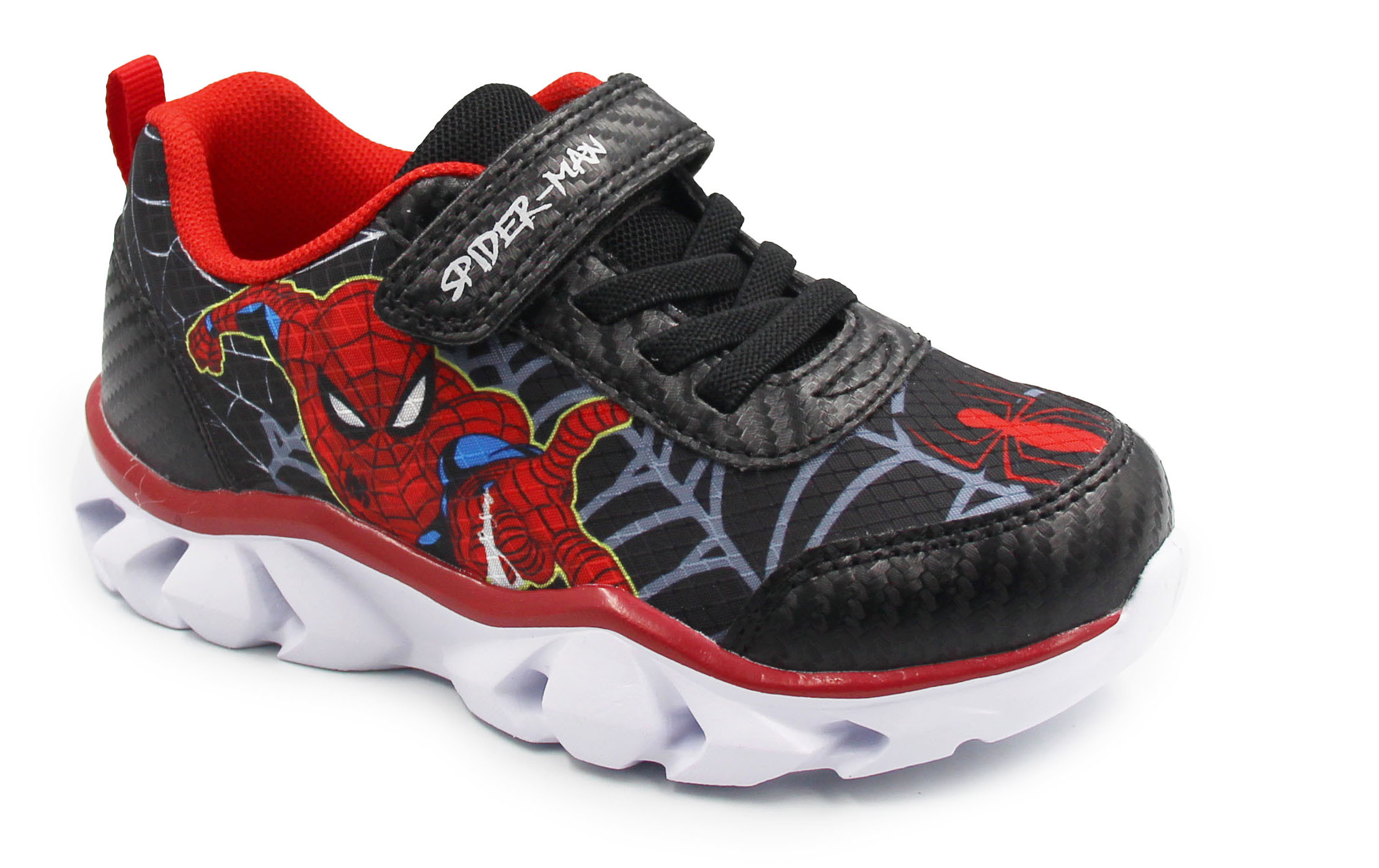 Wykonane z miękkich materiałów. W zewnętrznej stronie buta znajduje się bohater znanej bajki. Spider Man. Buty wyróżniają się aplikacją z motywem oraz wbudowanymi diodami LED, które świecą przy każdym kroku.