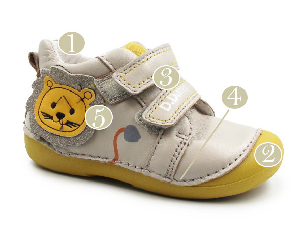 Zarówno z zewnątrz, jak i w środku, wykonane są z miękkiej skóry, co zapewnia komfort i odpowiednią wentylację dla stóp. Ich elastyczna, miękka podeszwa zapewnia swobodę ruchów. Miękki zapiętek delikatnie stabilizuje stopę, jednocześnie pozostawiając dużo miejsca na palce. Zapinane za pomocą dwóch rzepów, co jest praktyczne oraz szybkie, a dodatkowo umożliwia dziecku samodzielne zakładanie. Buty posiadają szersze czubki, co daje więcej miejsca z przodu na paluszki, przez co mogą one zachować naturalne ułożenie.