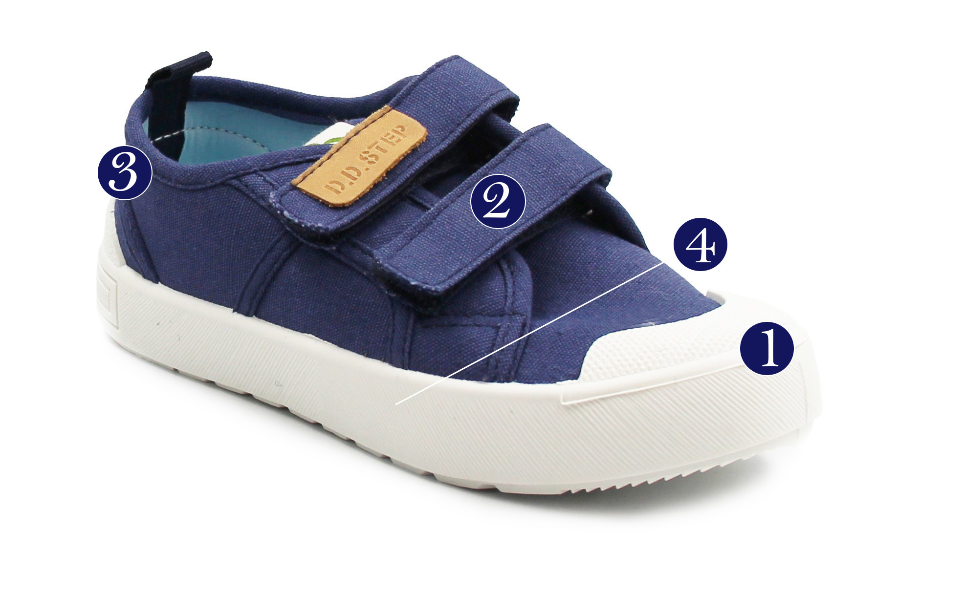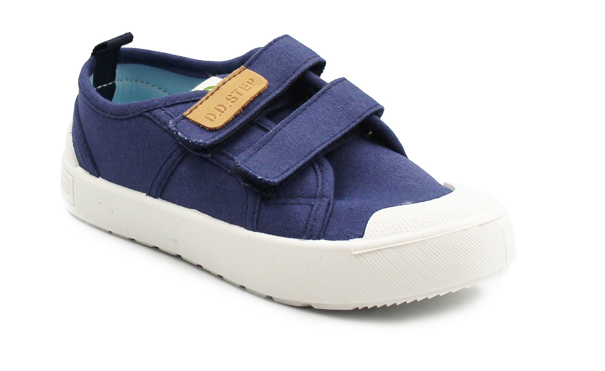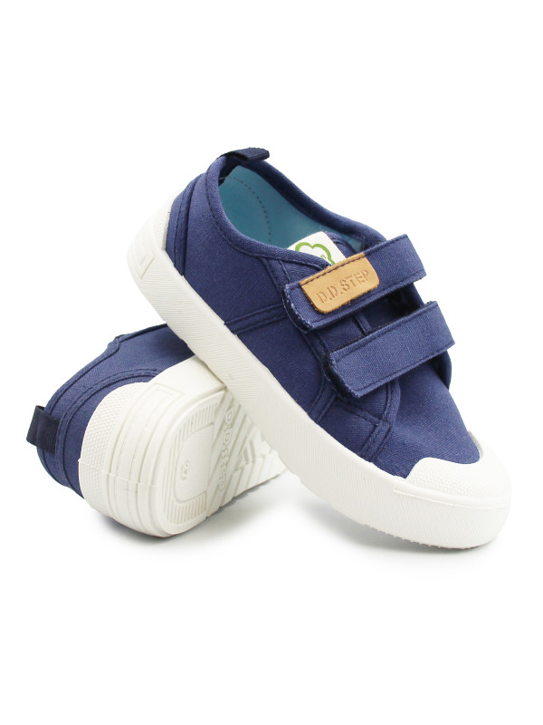 Dziecięce buty tekstylne w kolorystyce granatowej. To obuwie zarówno na dwór jak i jako obuwie zmienne do szkoły czy przedszkola. Regulowane za pomocą dwóch rzepów, które są szybkie, łatwe oraz praktyczne w użyciu. Wkładka delikatnie podpiera łuk stopy.