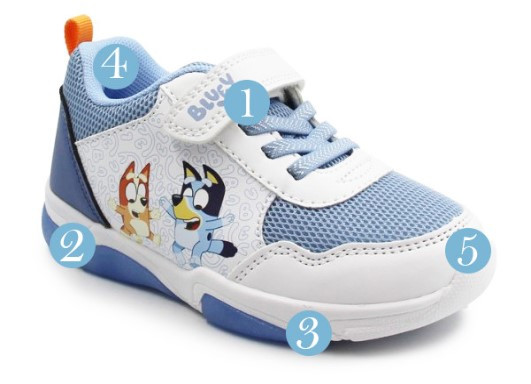 Wykonane z miękkich materiałów. W zewnętrznej stronie buta znajdują się bohaterowie znanej bajki Bluey. Buty wyróżniają się aplikacją oraz wbudowanymi diodami LED, które świecą przy każdym kroku w podeszwie.