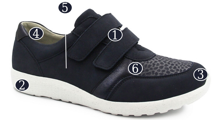1. Zapięcie za pomocą dwóch rzepów, które są wygodne, szybkie, co za tym idzie - praktyczne w użytkowaniu. Dają możliwość dopasowania obuwia do tęgości stóp.