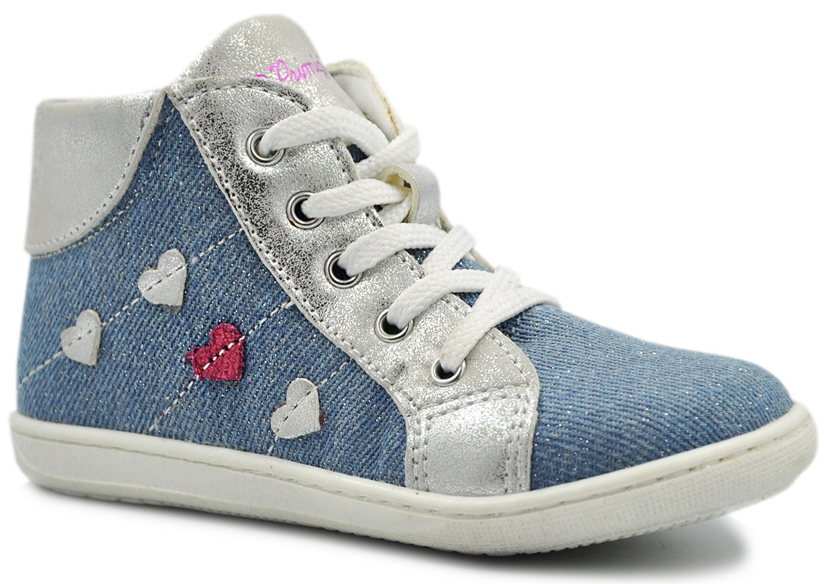 Jeansowe materiałowe trzewiki połączone ze srebrną skórą naturalną i uroczymi serduszkami.