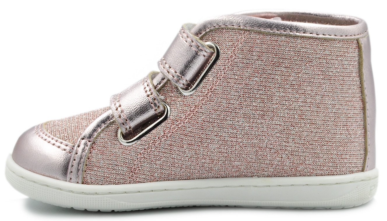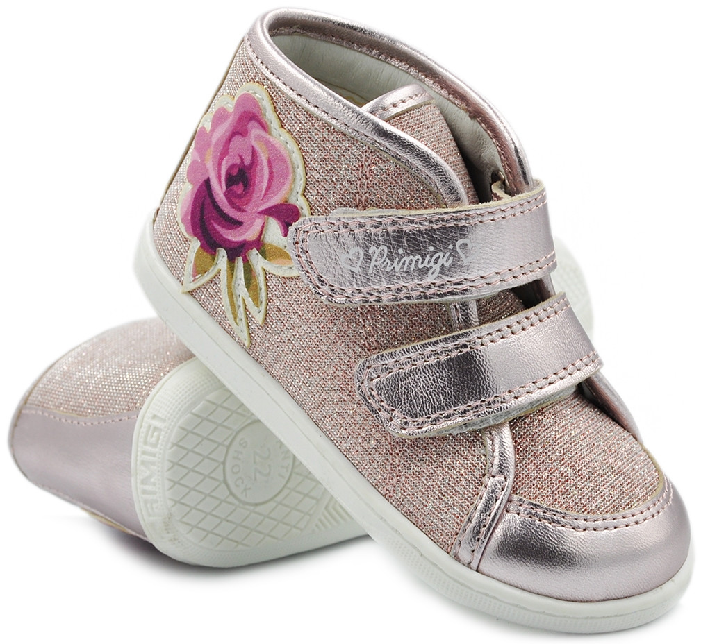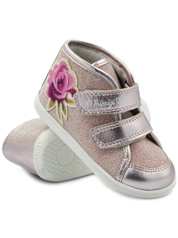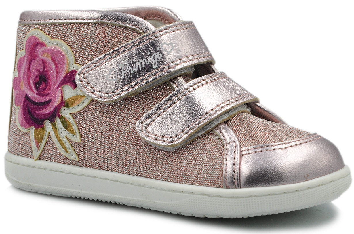 Śliczne dziewczęce trzewiki firmy PRIMIGI 3403600 w kolorze różu z metalizowanymi elementami i efektowną różą.