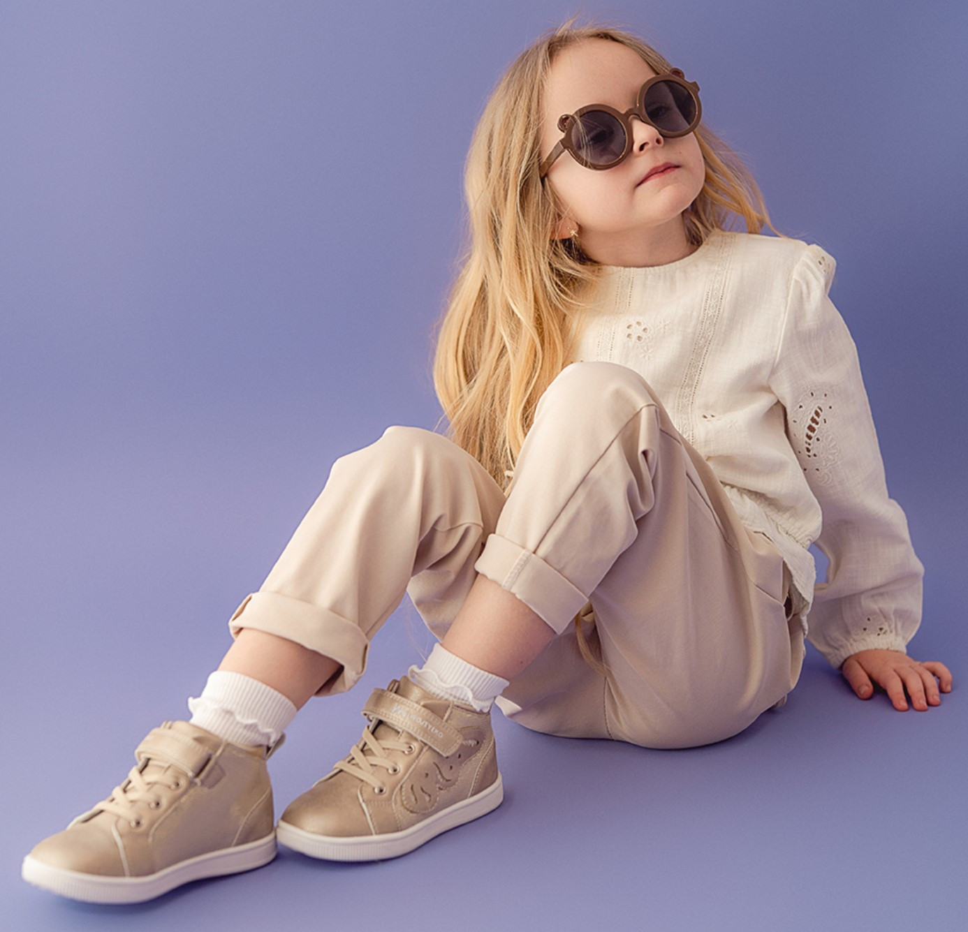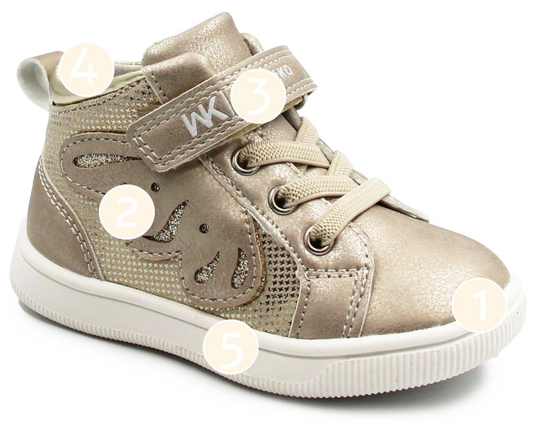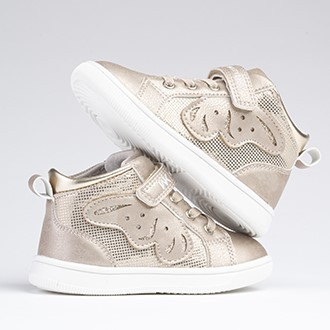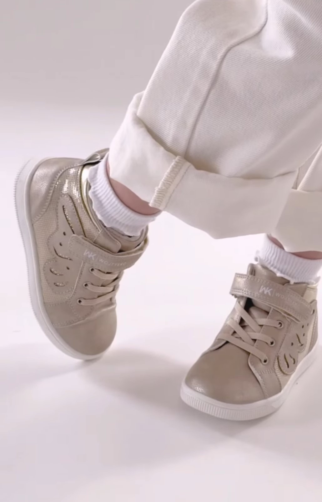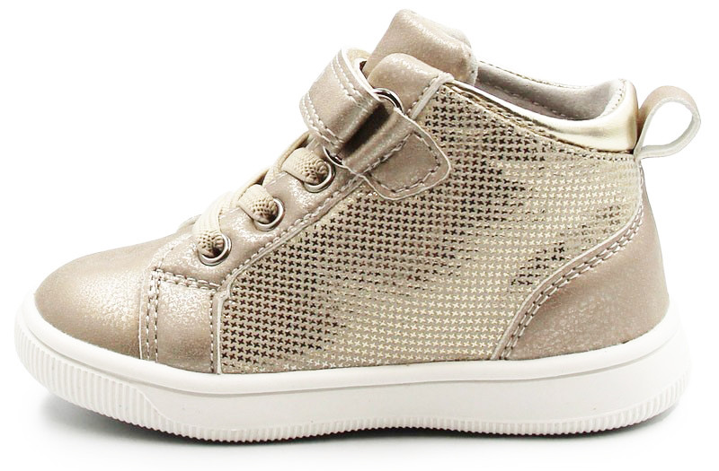 Dziewczęce buty wykonane ze skóry, zapinane za pomocą praktycznego rzepu, który umożliwia dziecku samodzielne założenie oraz zdejmowanie obuwia. Wnętrze wykonane jest ze skóry, co zapewnia odpowiednią wentylację. Czubki dodatkowo zabezpieczają palce. Wkładka wykonana jest z podwójnego materiału. Podklejona jest warstwą miękkiej pianki co znacznie poprawia komfort podczas użytkowania. Pianka podklejona pod skórą zapewnia dodatkową amortyzację, co jest szczególnie ważne dla aktywnych dzieci. Poniżej rzepu znajdują się gumy ściągające.