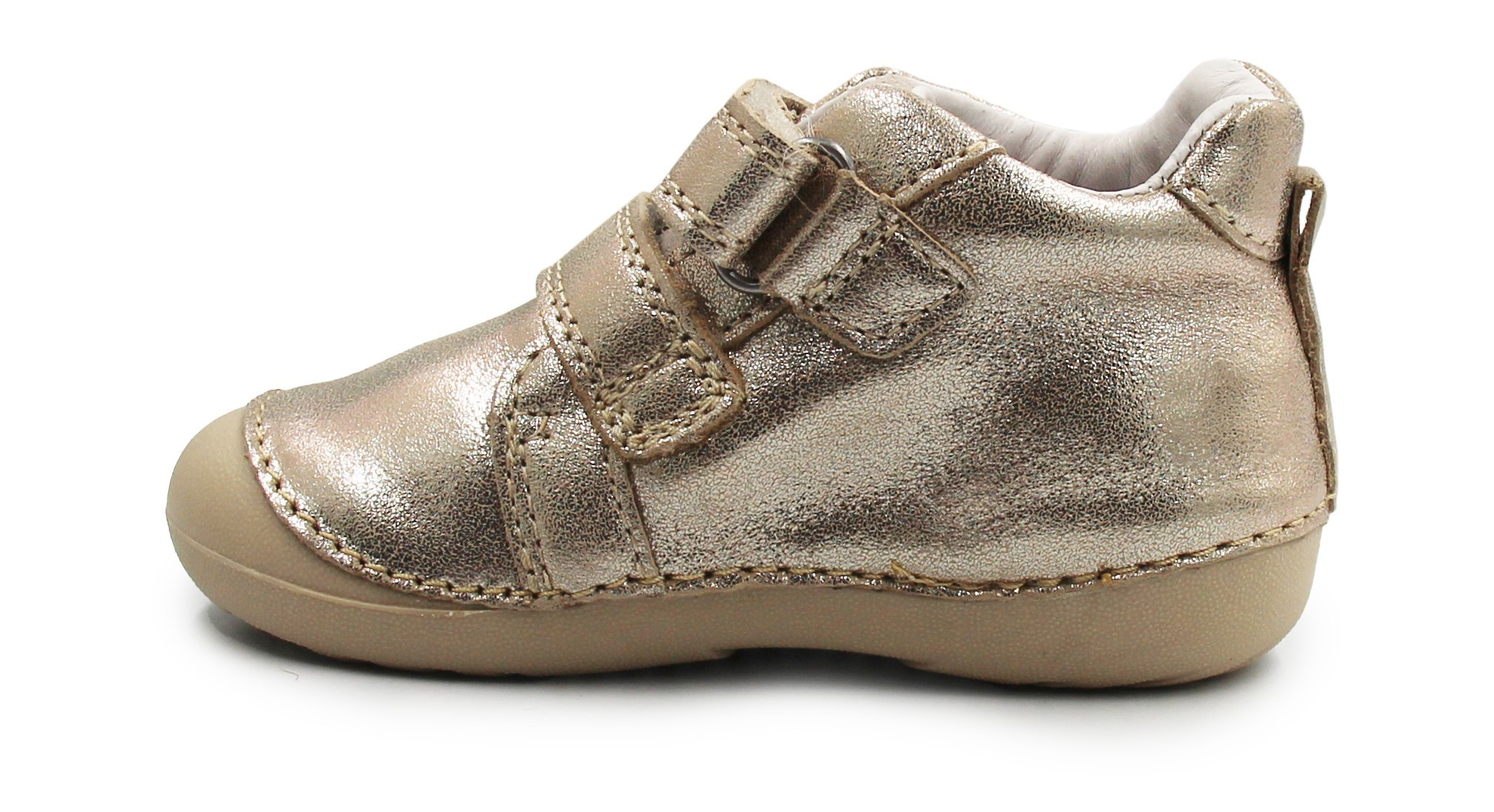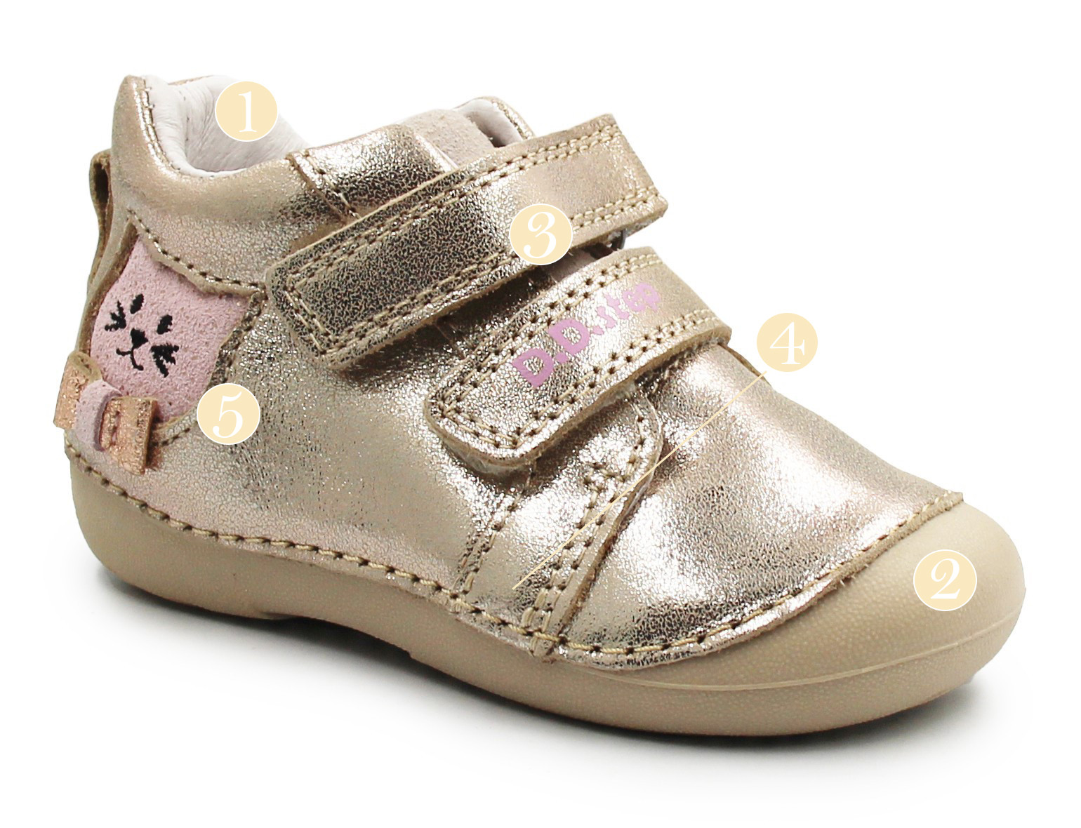 Zarówno z zewnątrz, jak i w środku, wykonane są z miękkiej skóry, co zapewnia komfort i odpowiednią wentylację dla stóp. Ich elastyczna, miękka podeszwa zapewnia swobodę ruchów. Miękki zapiętek delikatnie stabilizuje stopę, jednocześnie pozostawiając dużo miejsca na palce. Zapinane za pomocą dwóch rzepów, co jest praktyczne oraz szybkie, a dodatkowo umożliwia dziecku samodzielne zakładanie. Buty posiadają szersze czubki, co daje więcej miejsca z przodu na paluszki, przez co mogą one zachować naturalne ułożenie.
