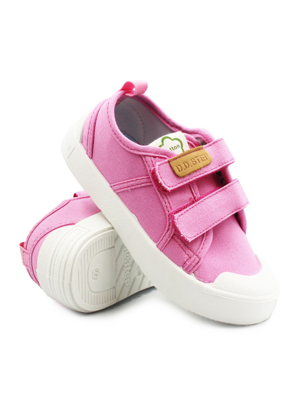 Dziecięce buty tekstylne w kolorystyce różowej. To obuwie zarówno na dwór jak i jako obuwie zmienne do szkoły czy przedszkola. Regulowane za pomocą dwóch rzepów, które są szybkie, łatwe oraz praktyczne w użyciu. Wkładka delikatnie podpiera łuk stopy.