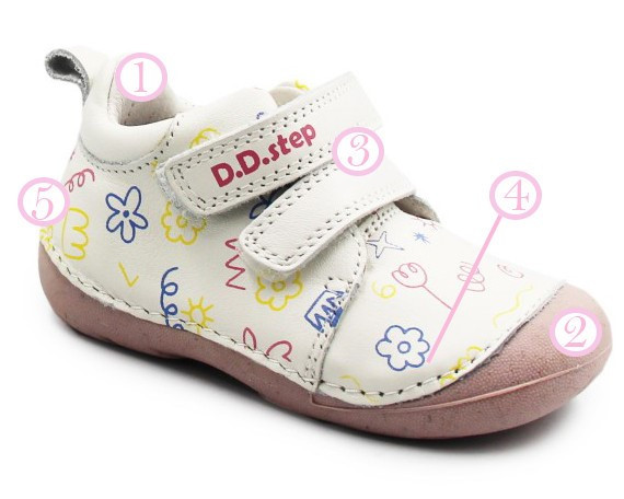 Zarówno z zewnątrz, jak i w środku, wykonane są z miękkiej skóry, co zapewnia komfort i odpowiednią wentylację dla stóp. Ich elastyczna, miękka podeszwa zapewnia swobodę ruchów. Zapinane za pomocą dwóch rzepów, co jest praktyczne oraz szybkie, a dodatkowo umożliwia dziecku samodzielne zakładanie. Buty posiadają szersze czubki, co daje więcej miejsca z przodu na paluszki, przez co mogą one zachować naturalne ułożenie.