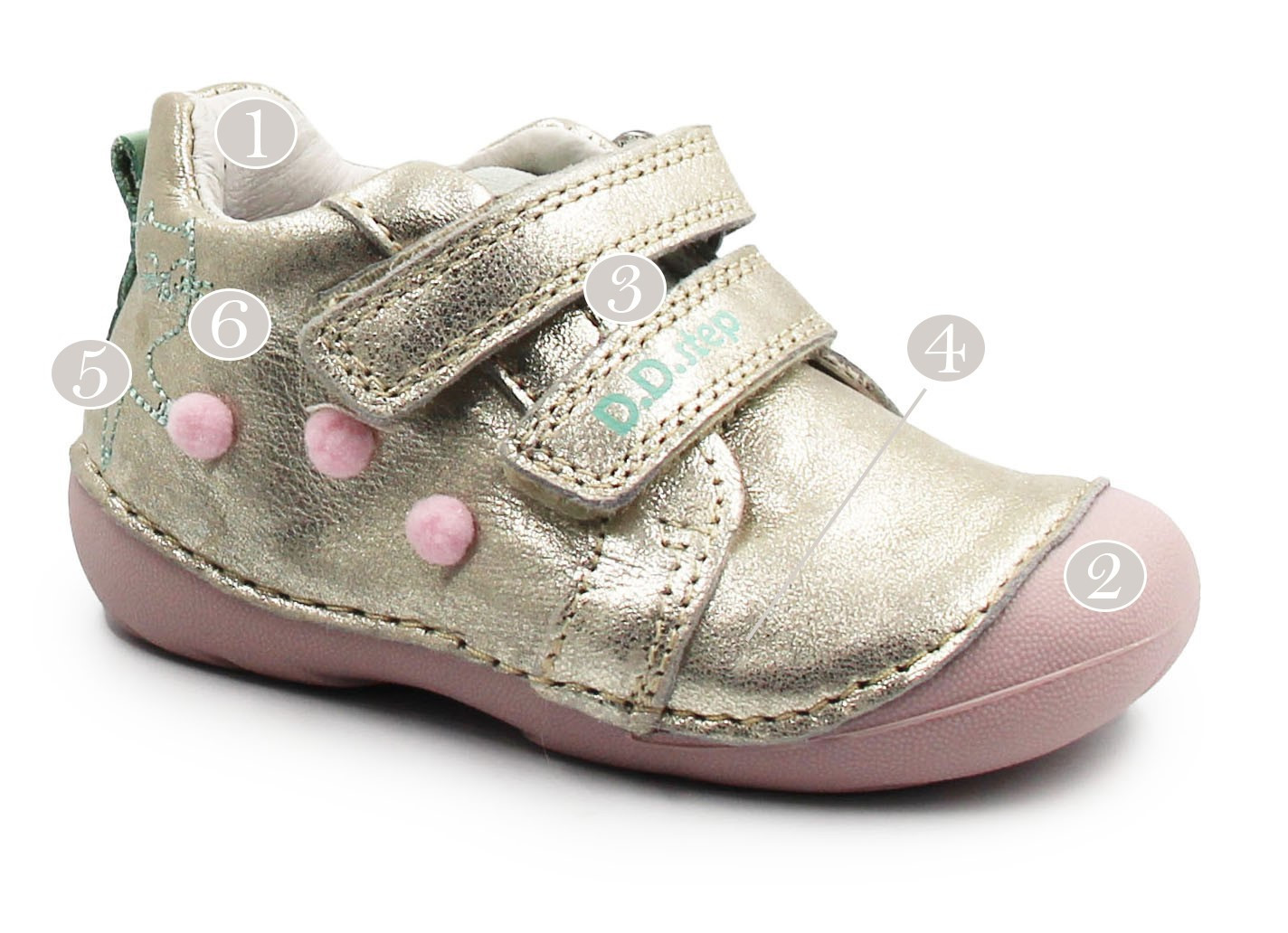 Zarówno z zewnątrz, jak i w środku, wykonane są z miękkiej skóry, co zapewnia komfort i odpowiednią wentylację dla stóp. Ich elastyczna, miękka podeszwa zapewnia swobodę ruchów. Zapinane za pomocą dwóch rzepów, co jest praktyczne oraz szybkie, a dodatkowo umożliwia dziecku samodzielne zakładanie. Buty posiadają szersze czubki, co daje więcej miejsca z przodu na paluszki, przez co mogą one zachować naturalne ułożenie.